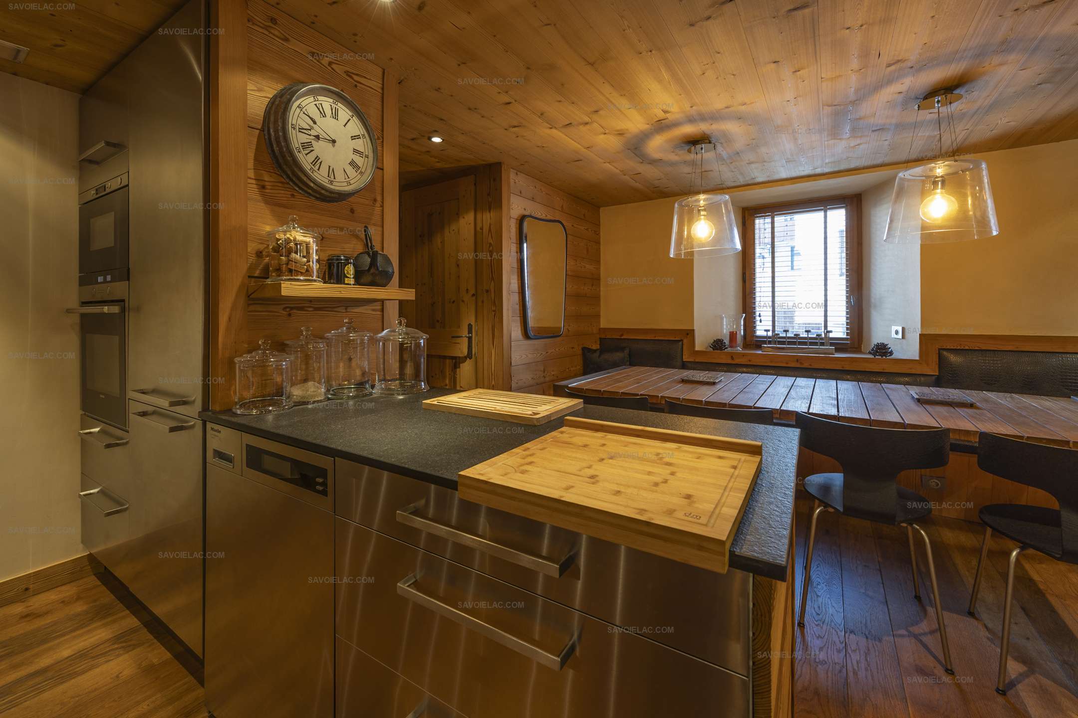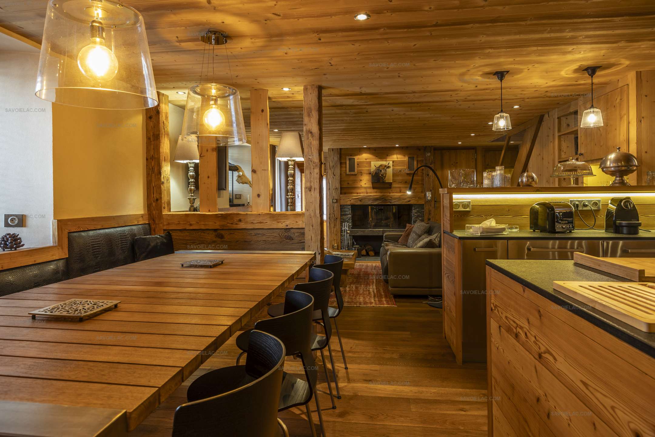Living room around the fireplace, one opening onto a balcony, dining room, all equipped kitchen: dishwasher, oven, fridge, freezer, microwave, Nespresso machine and filter machine, kettle, kitchen utensils...