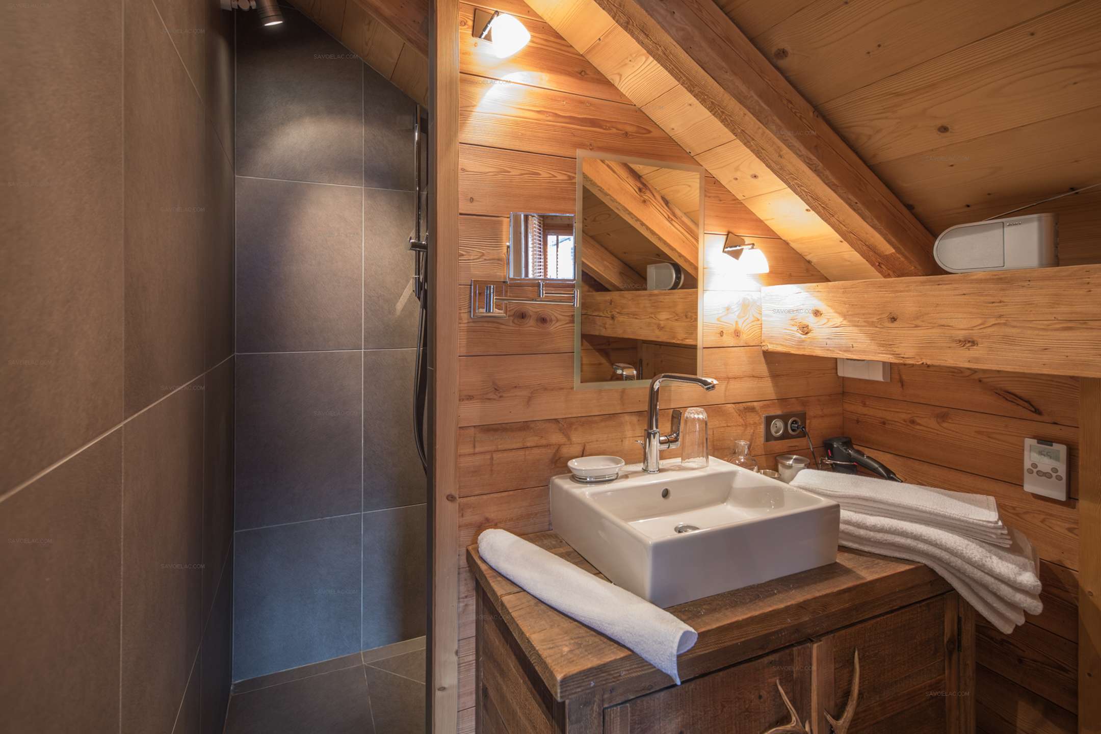 Bathroom 2: Ensuite with bedroom 1, shower, sink, towel dryer.
