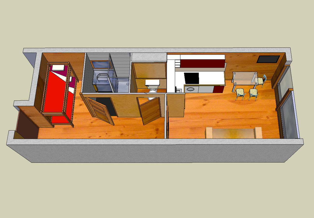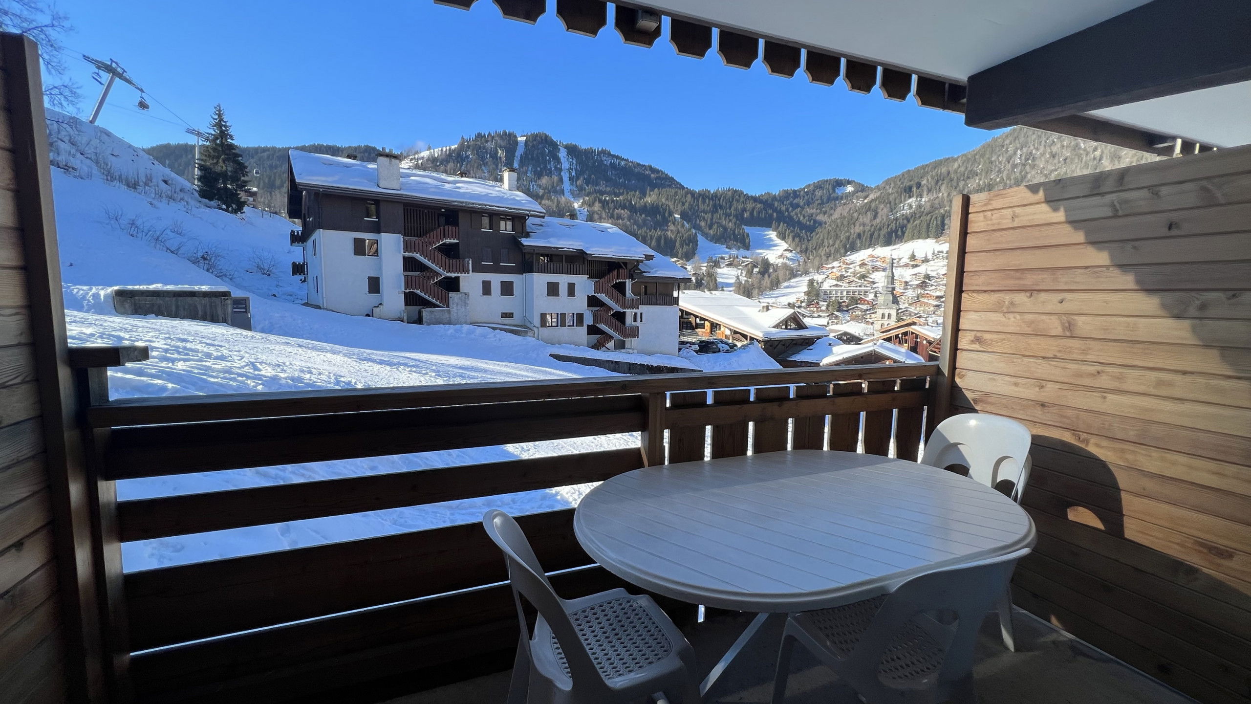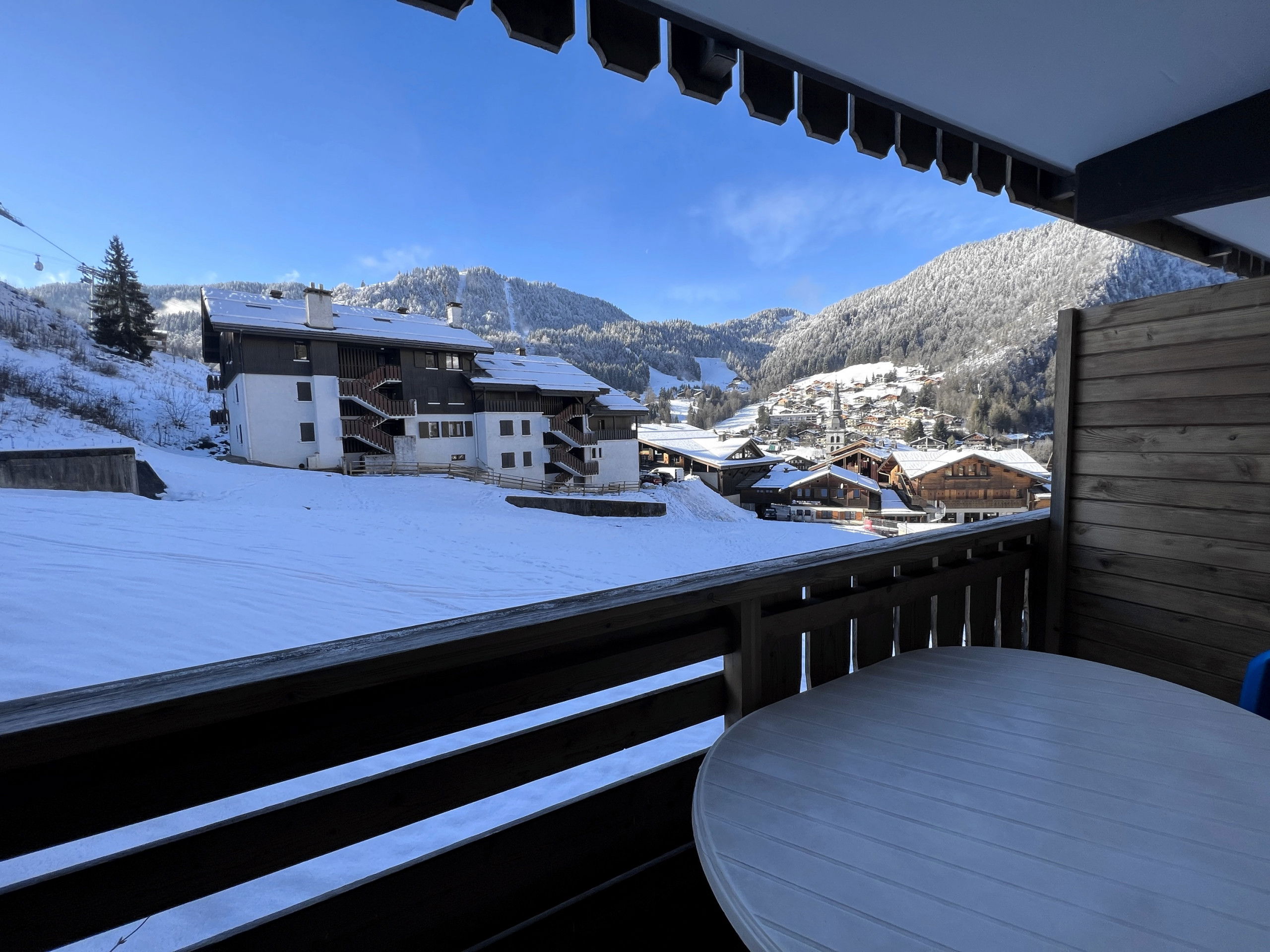 LIVING ROOM: (PVC floor) 14,16 m2, 1 CLIC CLAC BEDROOM 2 PERS (130), flat screen TV, living room table, a south bay, french window leading to a south balcony of 5.45 m2, garden furniture, view on the slopes and mountains,