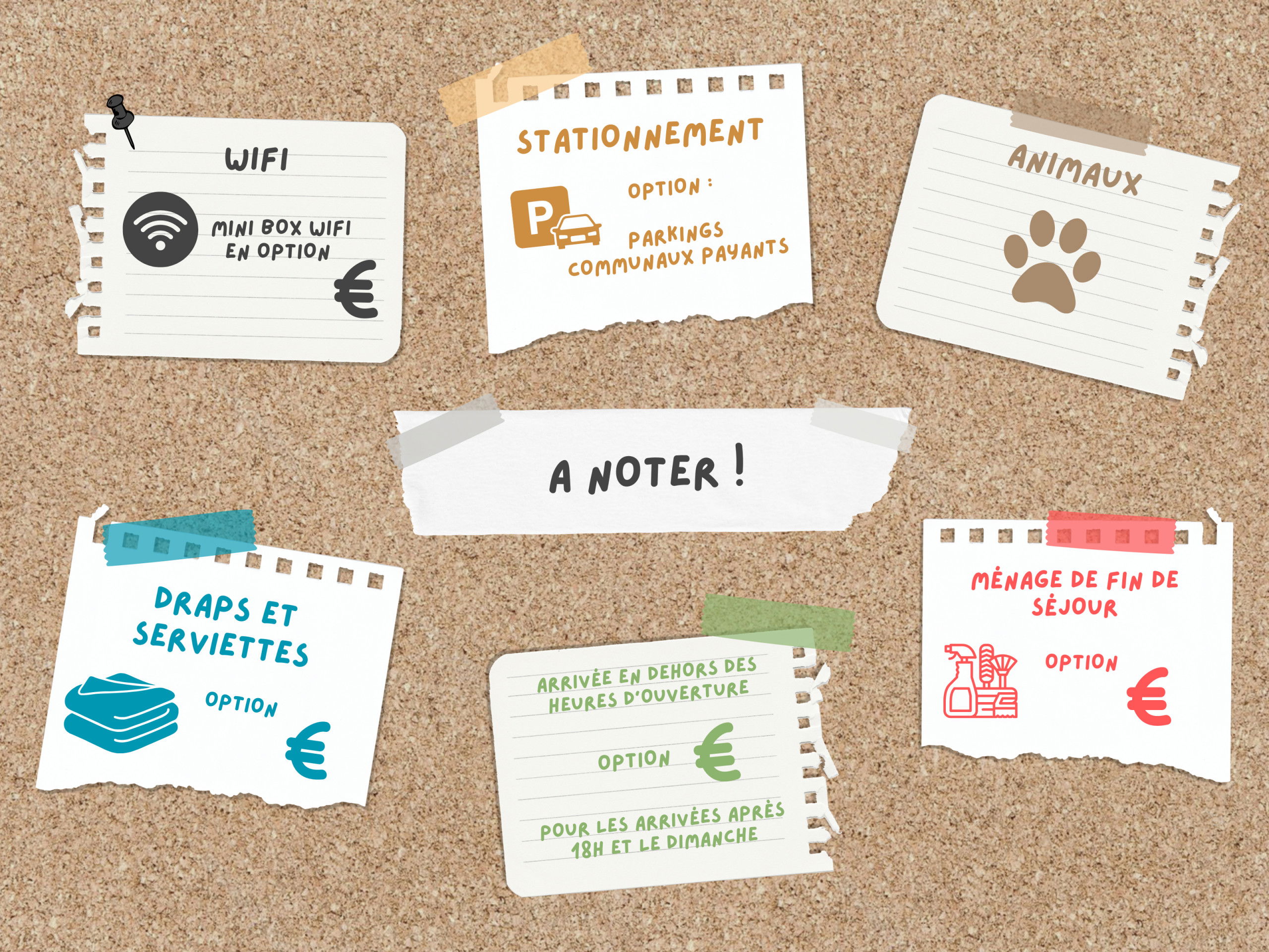 - Rental of sheets, pillowcases, towels, bath mats, tea towels: email sent 20 days before arrival to order linen (order to be placed no later than 10 days before arrival).