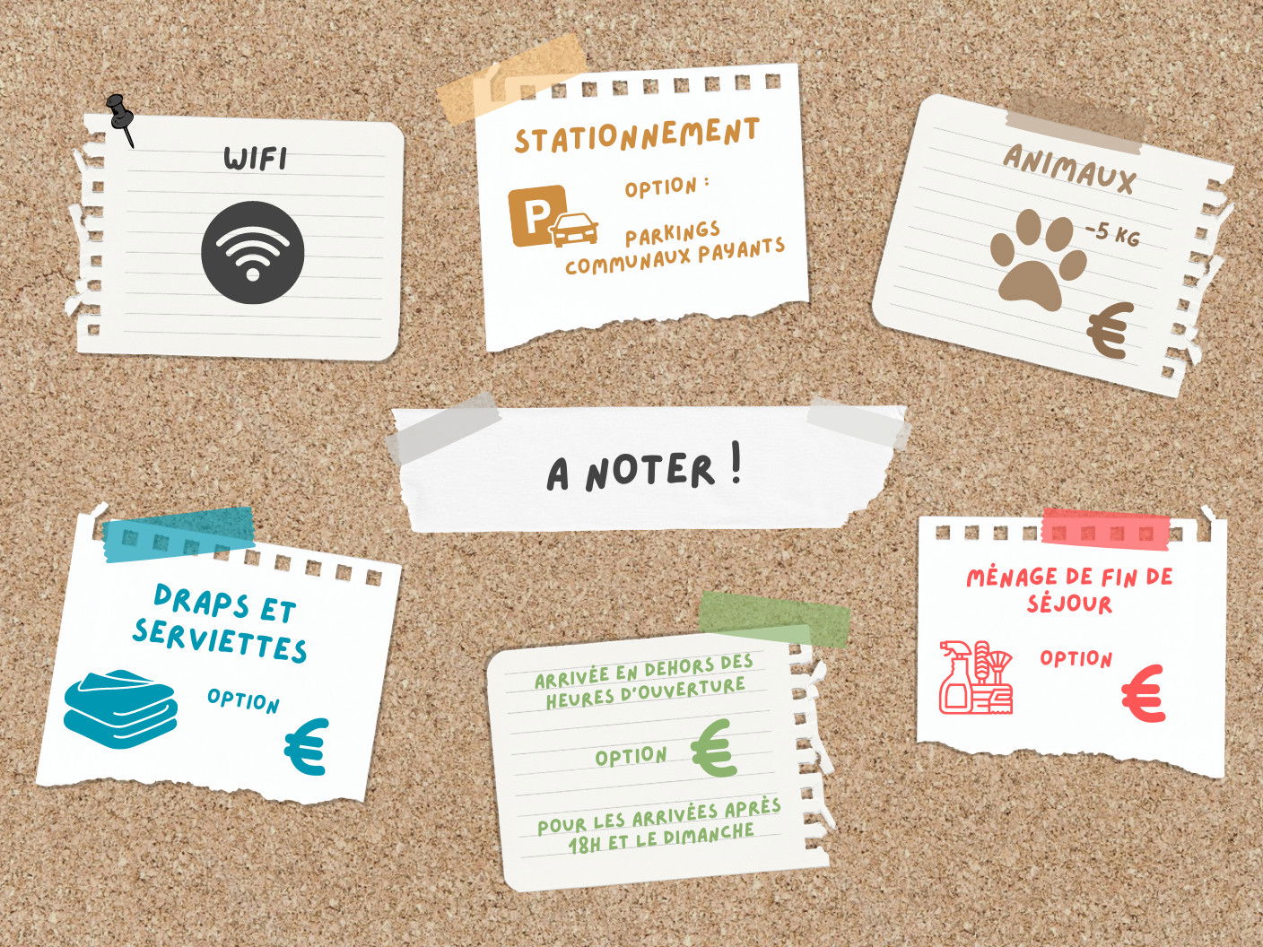 - Linen rental: sheets, pillowcases, towels, bath mats, tea towels ...: to be taken at the agency on the day of your arrival