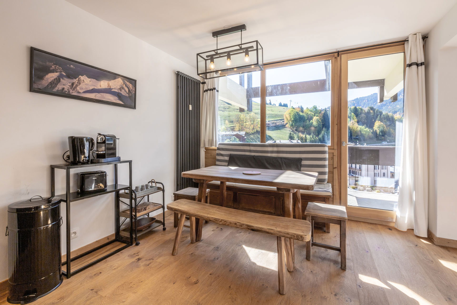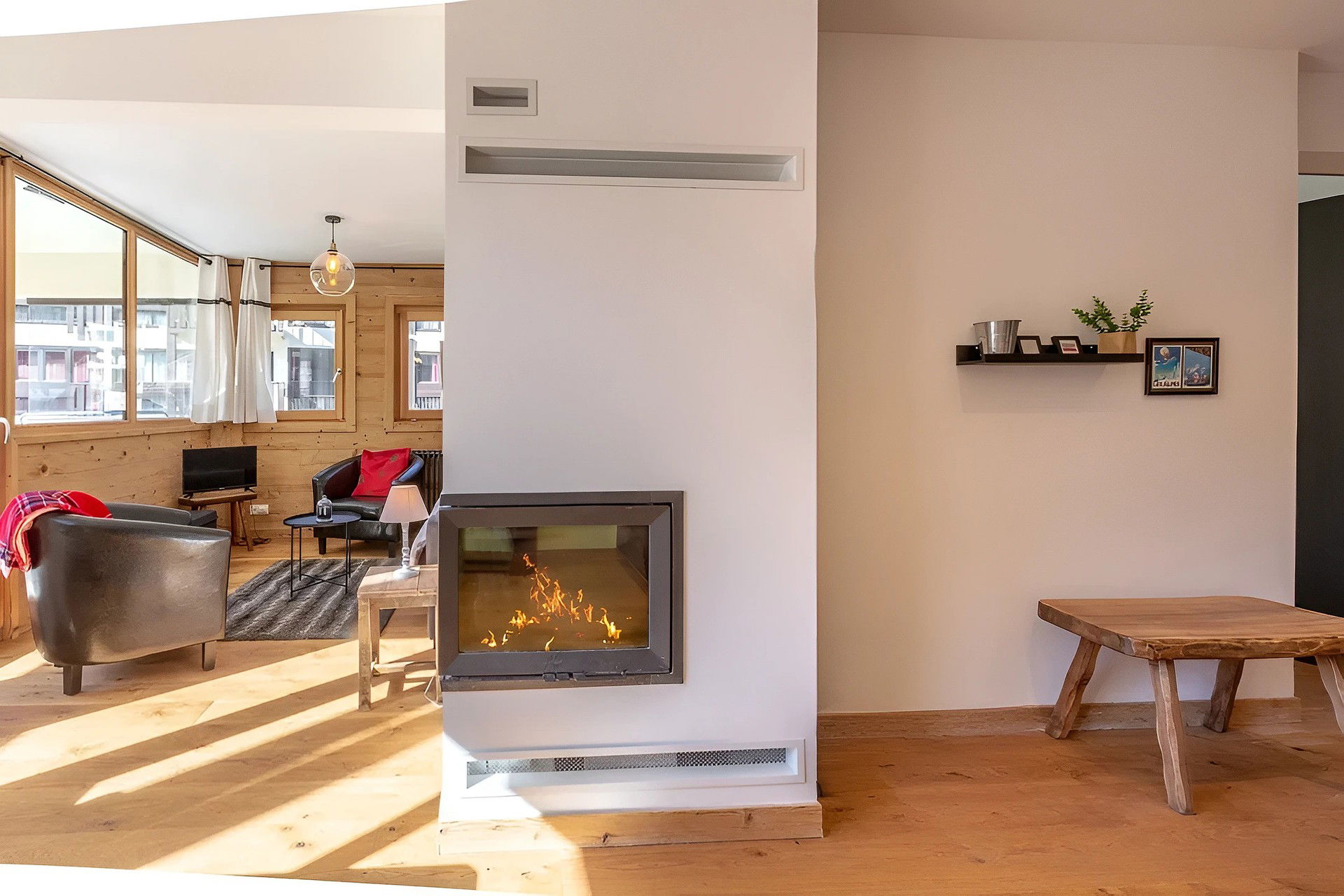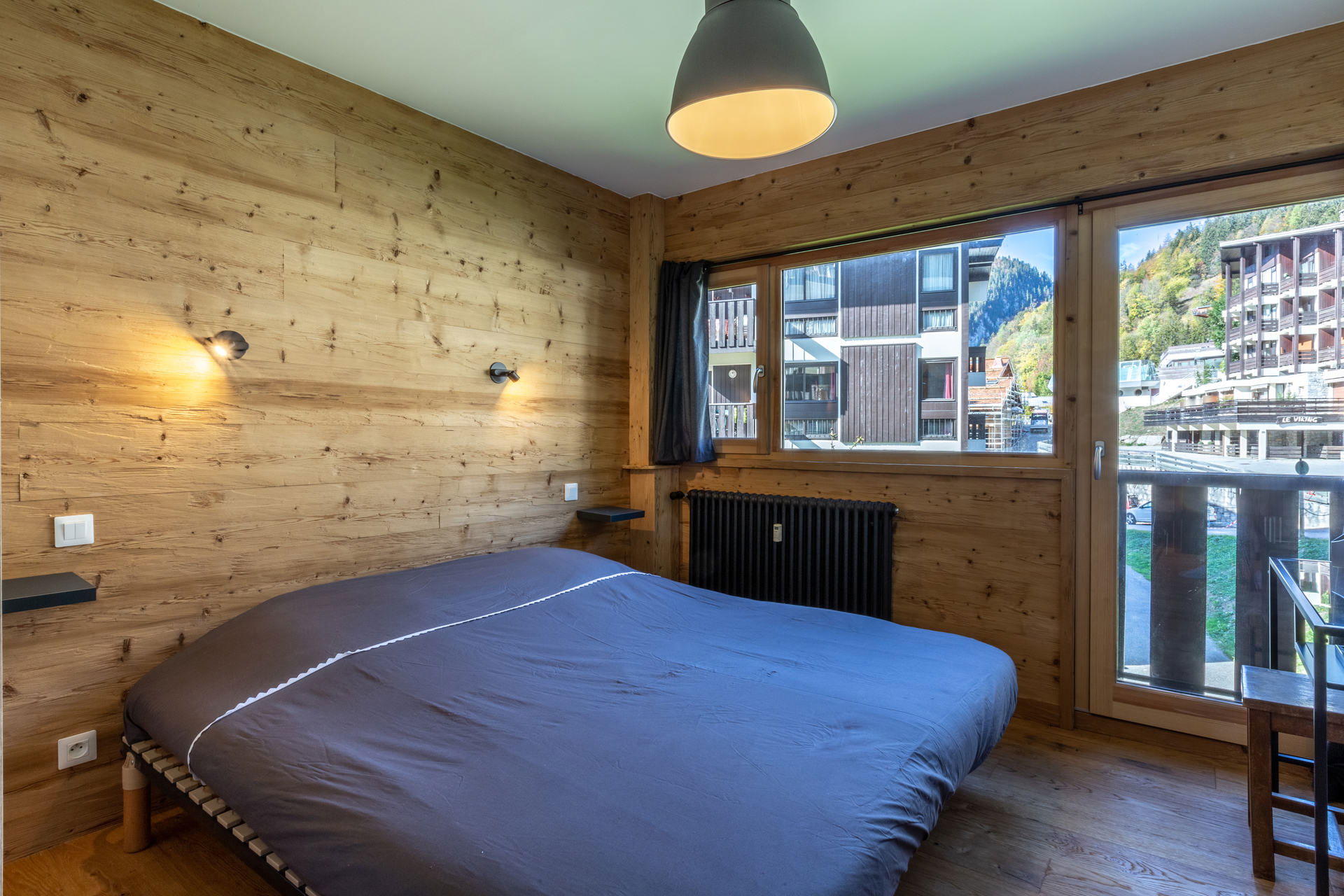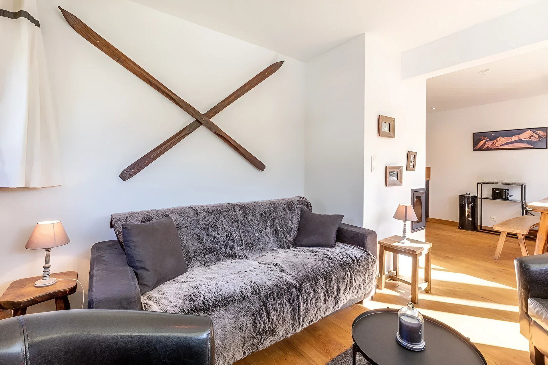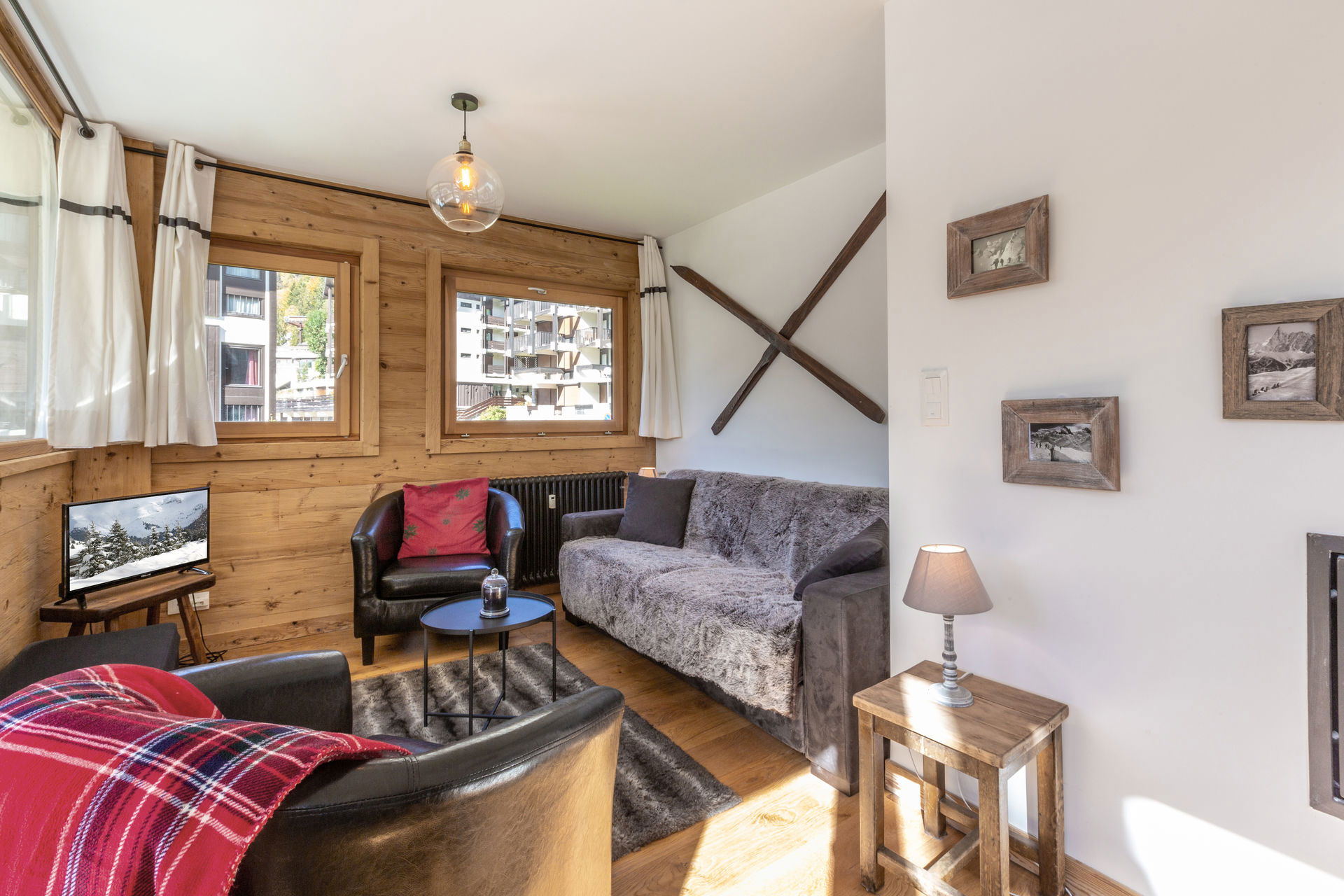 - LIVING-ROOM (10.52 m²): flat screen TV, 1 DOUBLE CONVERTIBLE SOFA BED (140), west facing window, next door residences / road's Piscine, bay, south facing bay-window, access south facing balcony, next door residence / village / moutains view