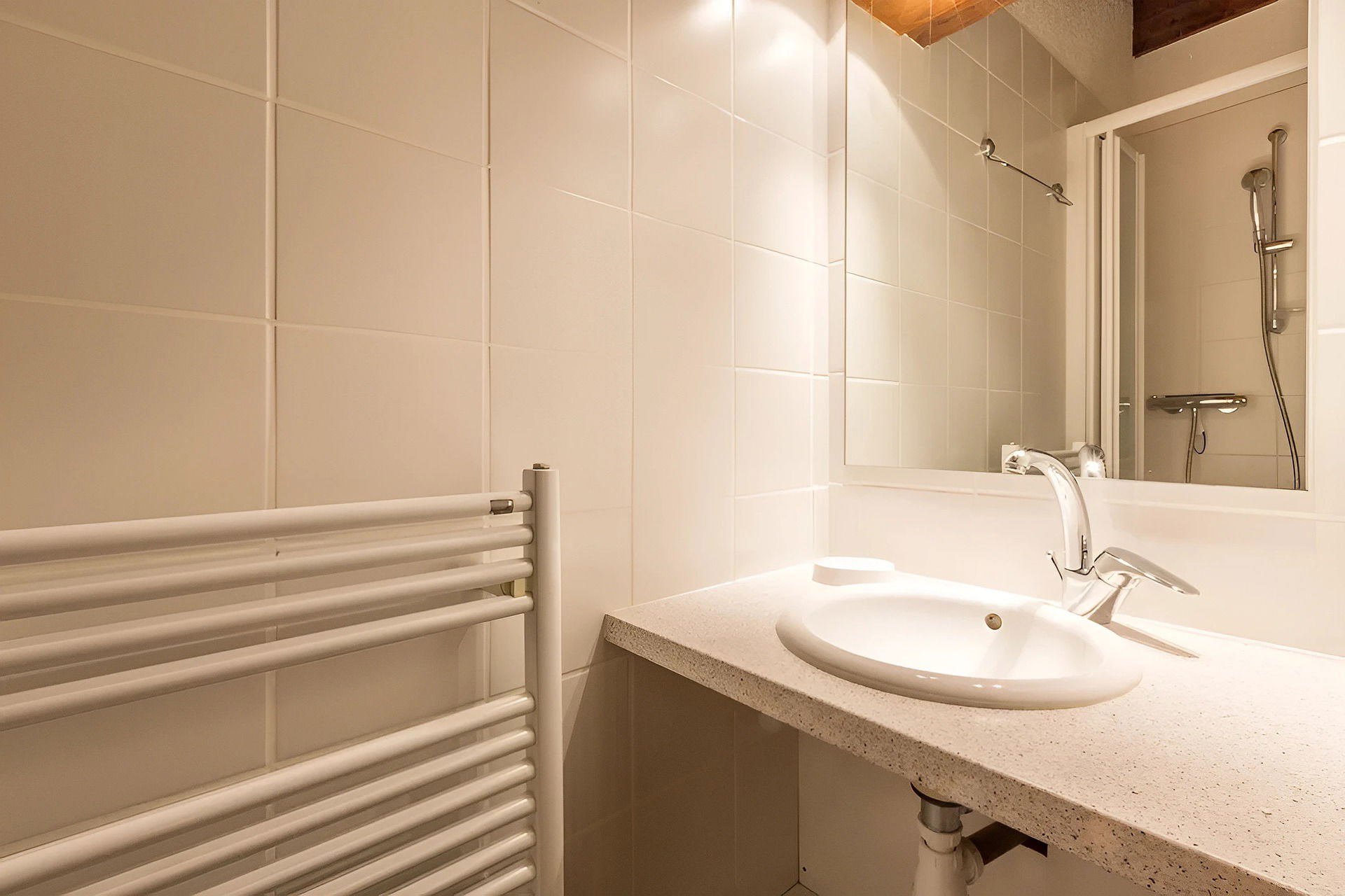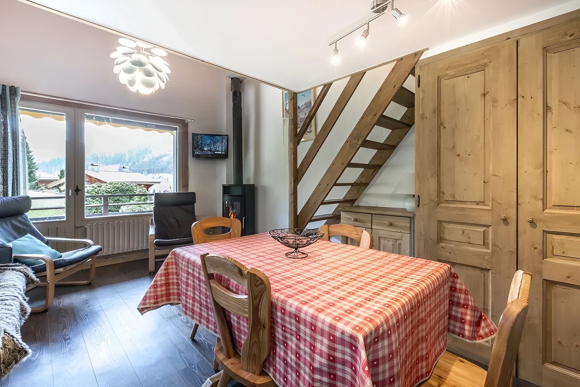 The entrance, located on the floor, distributes the spaces smoothly. The living room, which is bright thanks to its east and south-east facing windows, combines a dining area and a relaxation area with a stove, creating a warm atmosphere. The open kitchen, integrated into the living room, is perfect for everyday living. French windows extend the room onto the balcony, offering a pleasant view of the mountains.