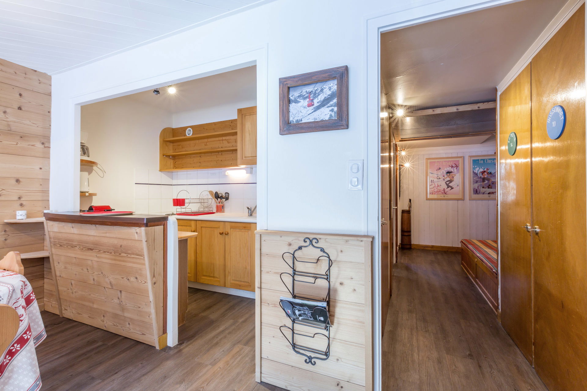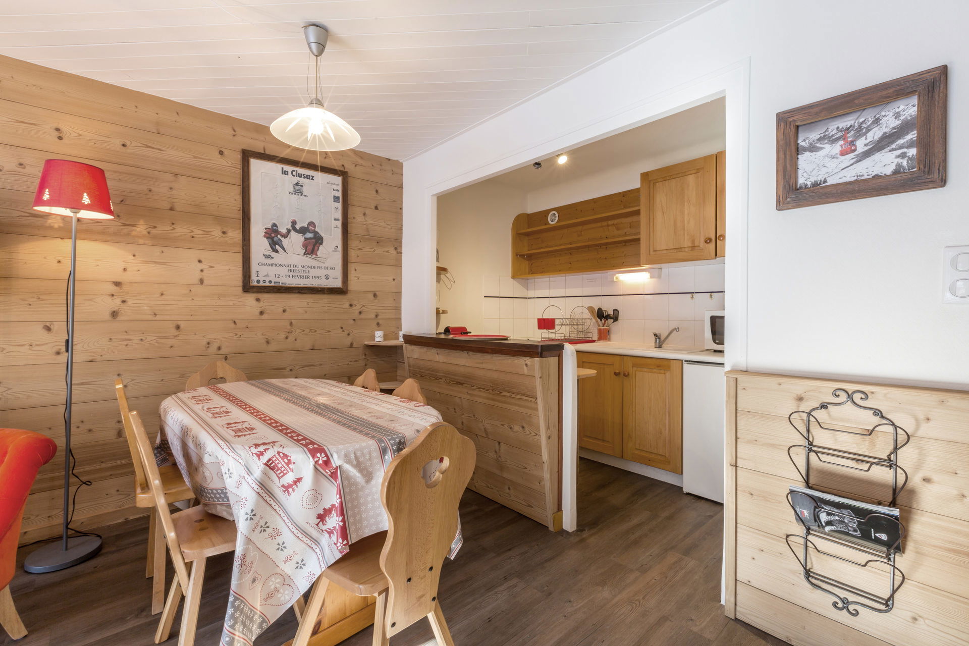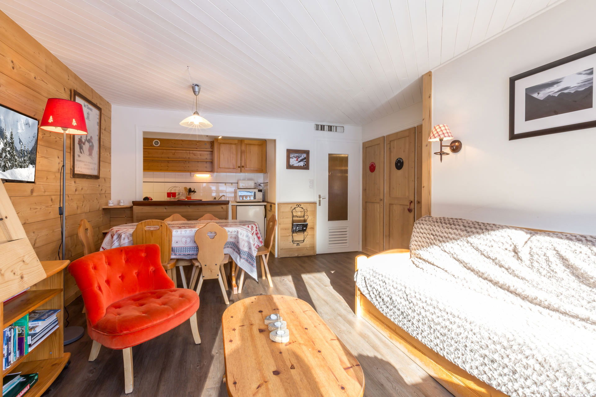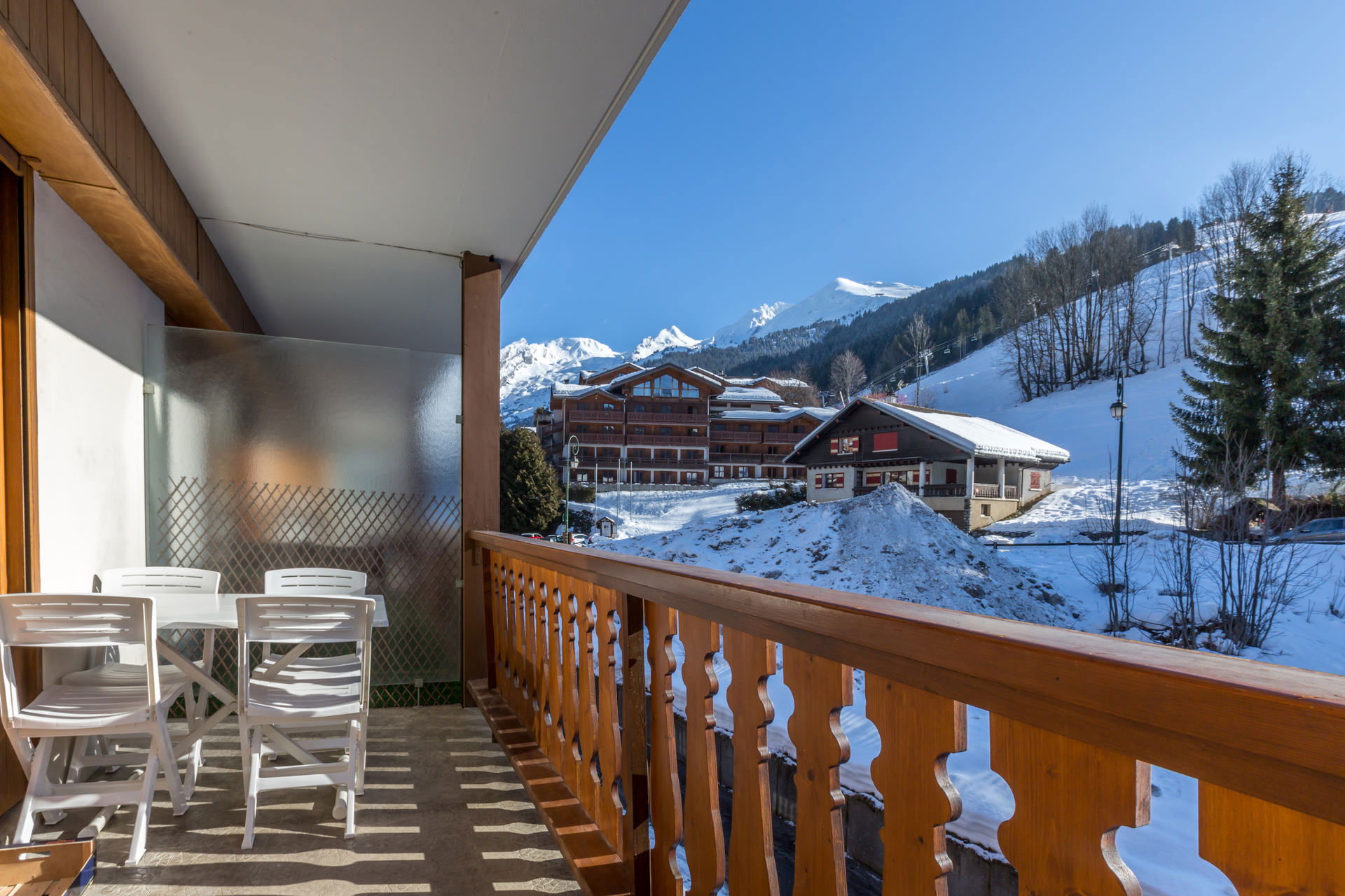 - LIVING ROOM (19 m²): eating place, 1 SINGLE SOFA BED (80) + 1 SINGLE PULL-OUT BED (80), DECORATIVE FIREPLACE, flat screen TV, south facing bay window + French window + balcony, next door residence / route du Col des Aravis / mountain view