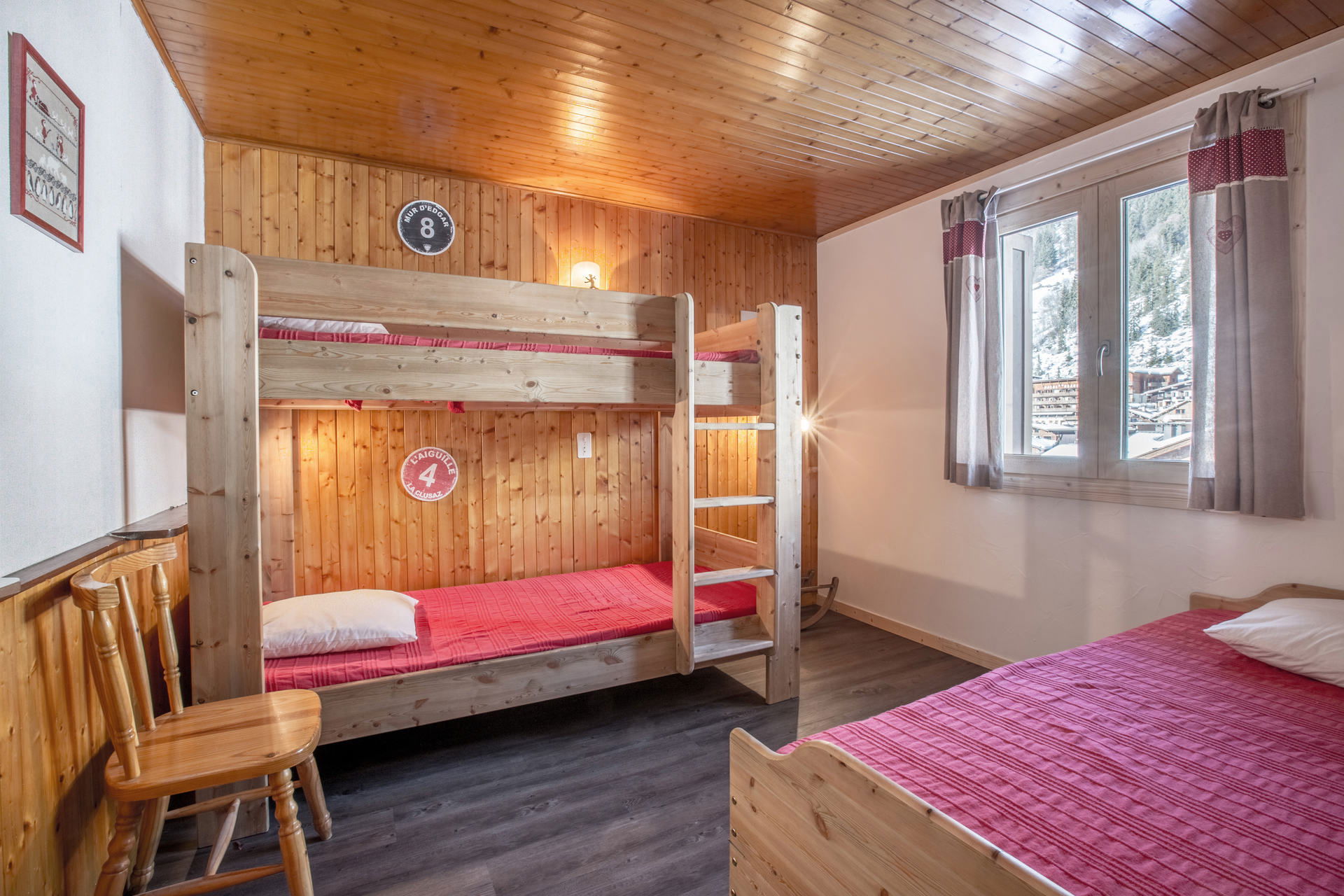- BEDROOM (9.82 m²): 2 BUNK BEDS (90) -> upper bed forbidden under 6 years old + 1 SINGLE BED (90), north facing window, back of the residence view