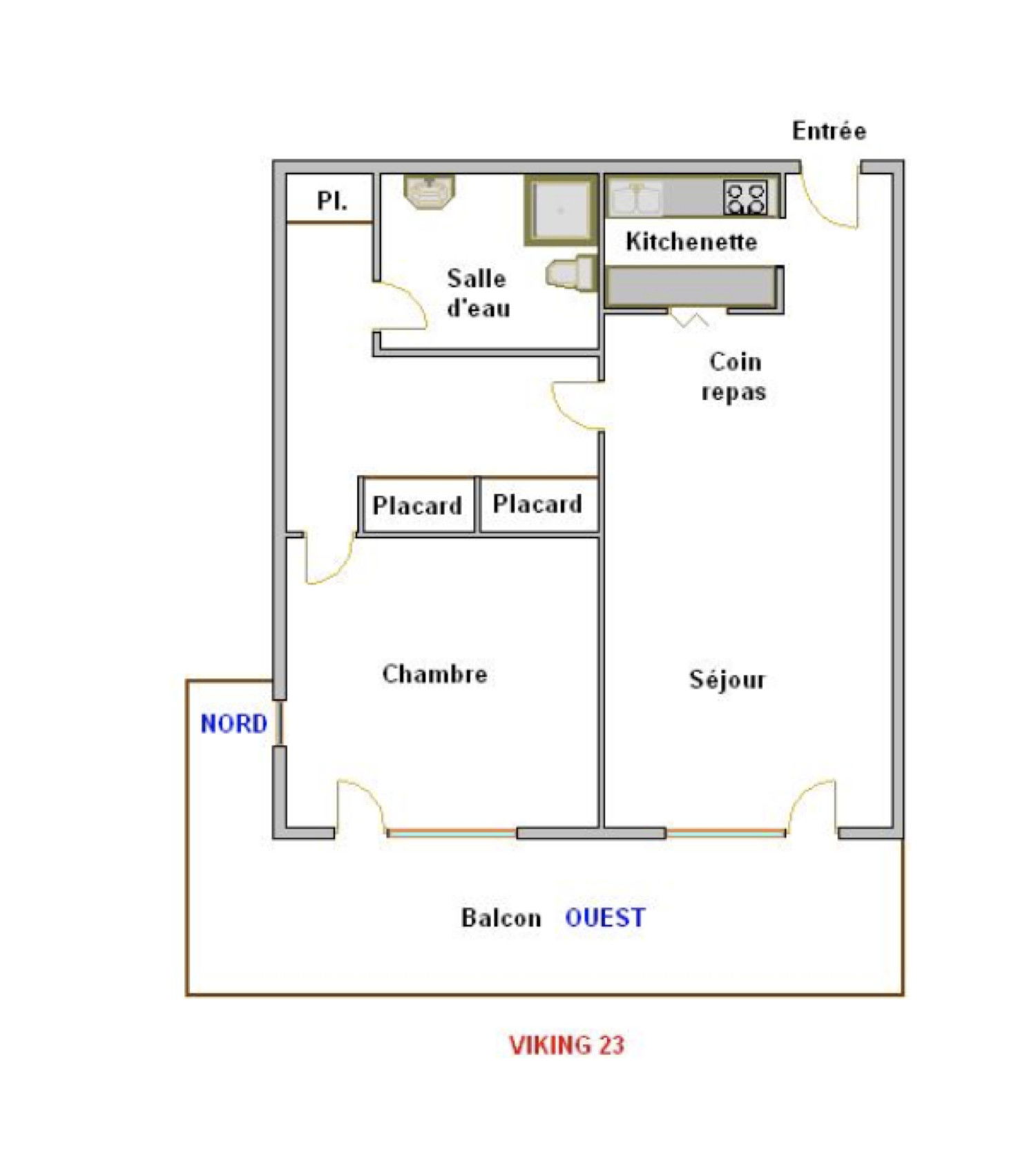 BEDROOM (8.52 m²): 2 BUNK BEDS (90) + 1 SINGLE BED (80) -> upper bed prohibited under 6 years old, north window, window + west French window, west balcony, view of pedestrian access / aquatic area