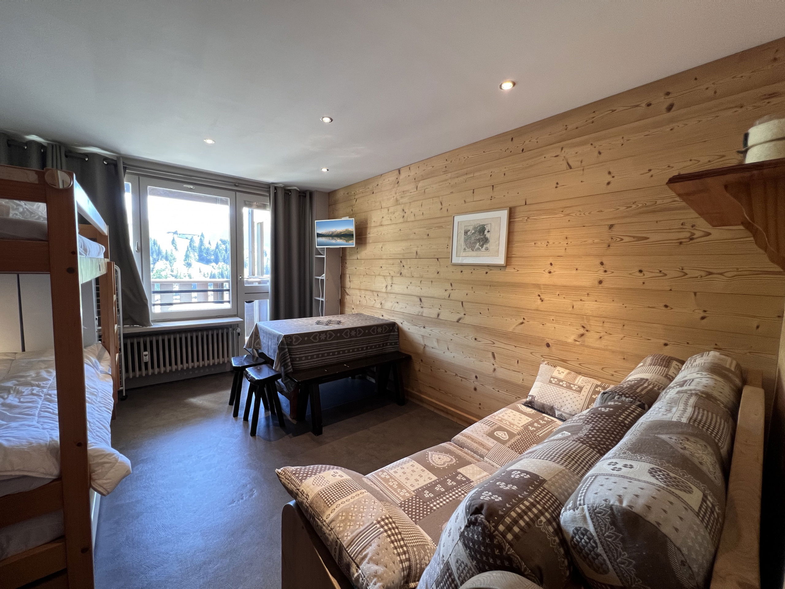 LIVING ROOM: (parquet floor) 13.39 m2, 1 bunk beds (80 cm), (high bed prohibited -6 years old), 1 RAPIDO sofa bed for 2 people (140 cm), wardrobe storage, television, French window opening onto a balcony south (possibility to store skis), beautiful view of the mountains and the village,