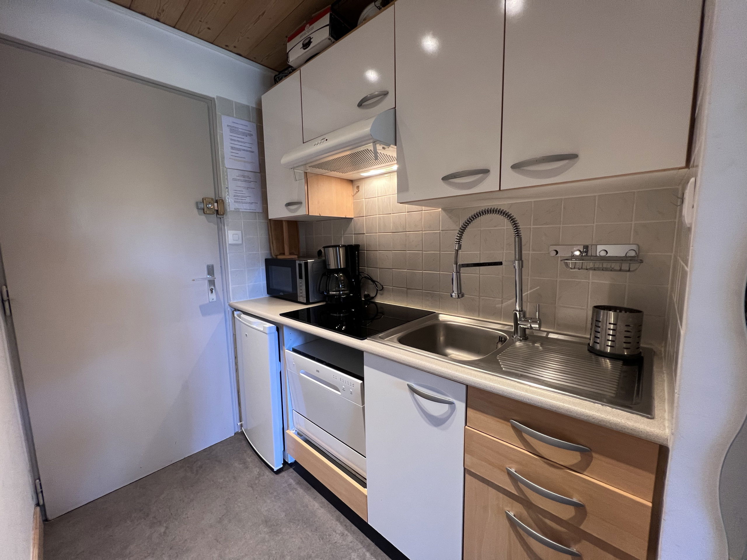 ENTRANCE/KITCHEN CORNER: (parquet floor) 3.24 m2, fridge (134L), microwave, ceramic hob, dishwasher, fondue set, filter coffee maker, kitchen utensils