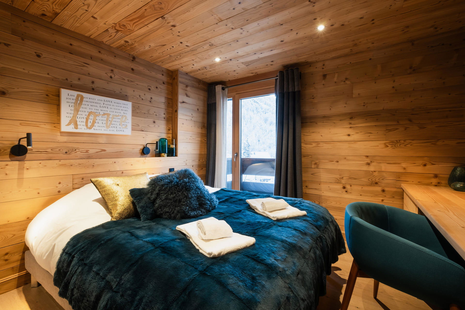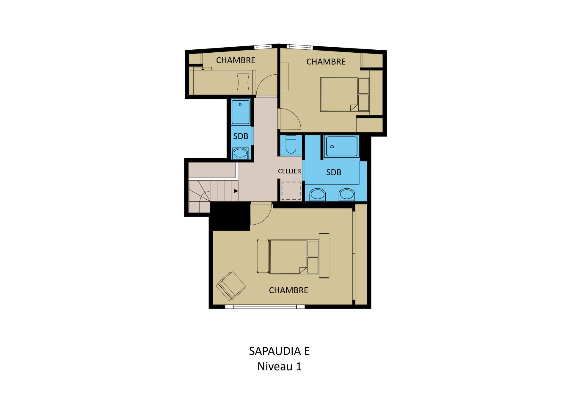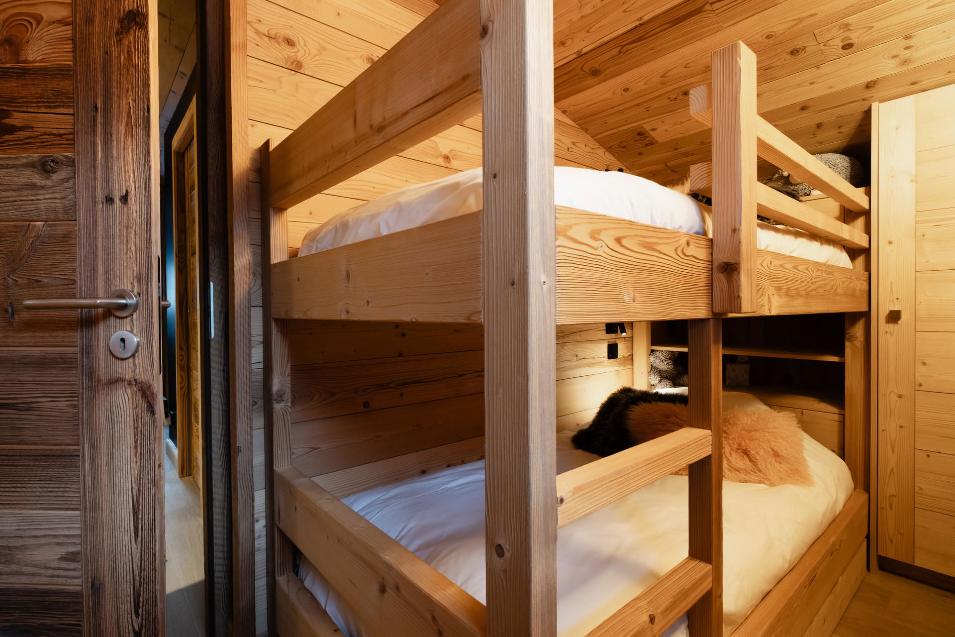 This level features a double bedroom (160 cm bed) offering stunning mountain views, perfect for waking up facing the peaks. A second double bedroom (160 cm bed) and a bedroom with bunk beds (90 cm) both overlook the rear of the residence, in a peaceful atmosphere. Two bathrooms with shower complete this level.