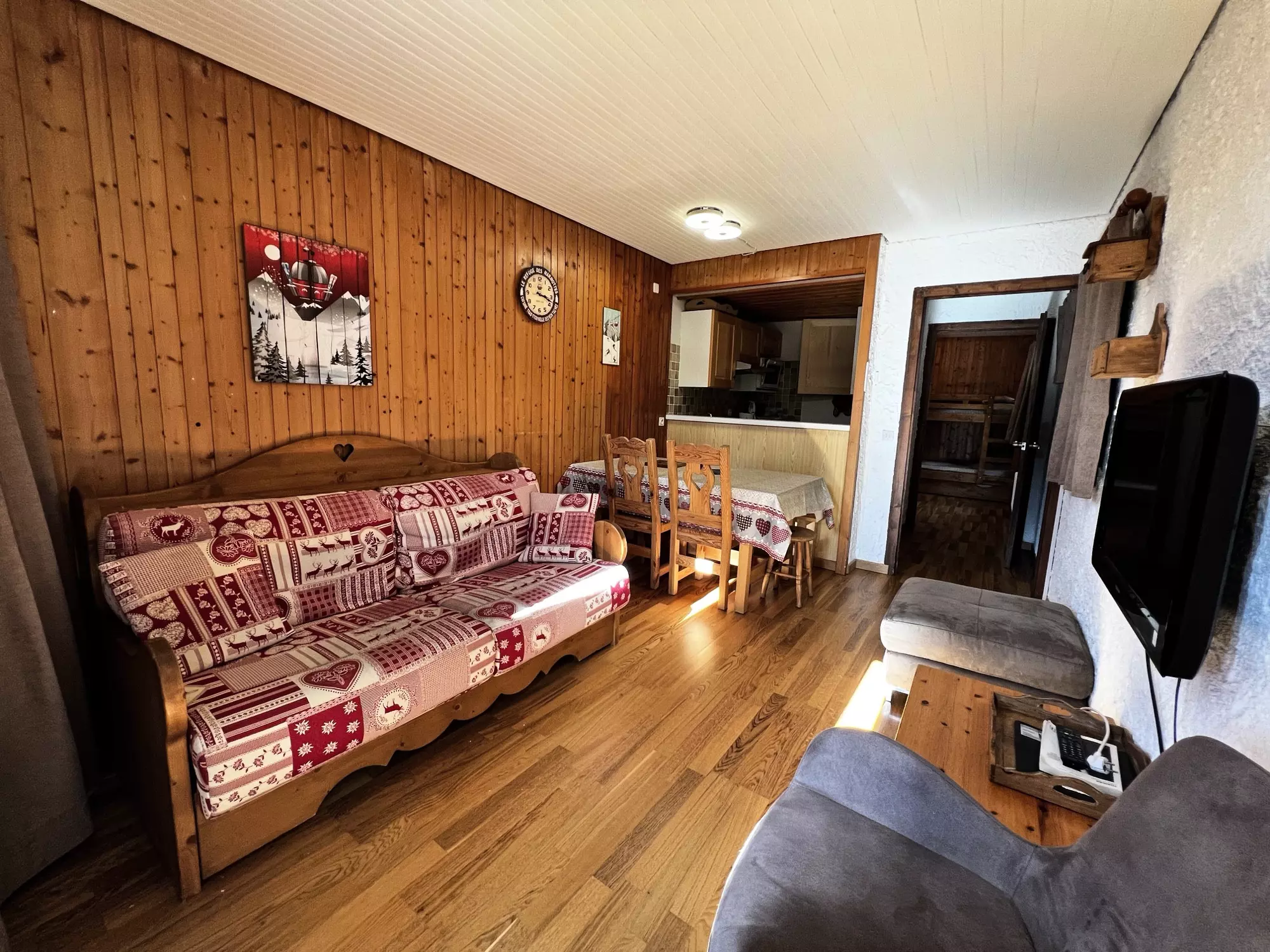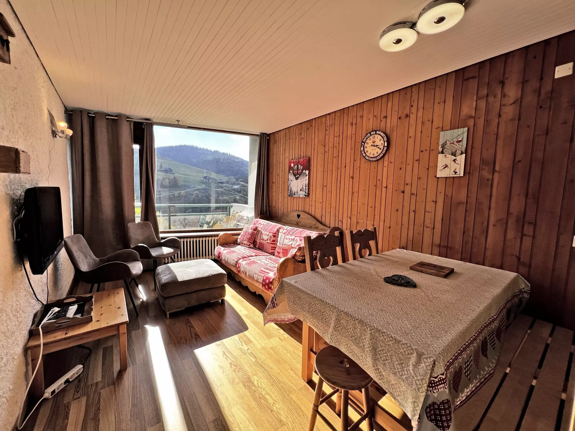 Apartment on the level (entrance level on R+1 on ground floor) of a two-level residence, with 14 apartments, built in 1988, located 50 meters from the ski lifts, set back from the Col des Aravis road, and 3.5 km from the center of LA CLUSAZ. Direct access, behind the residence, to the Combe des Juments slope allowing you to reach the chairlift and the Transval 30 m away. 150 m from a ski bus stop (free). Quiet location, beautiful view of the Etale and Beauregard Massif. Summer: access to a private heated swimming pool (24C°) at the unsupervised residence.