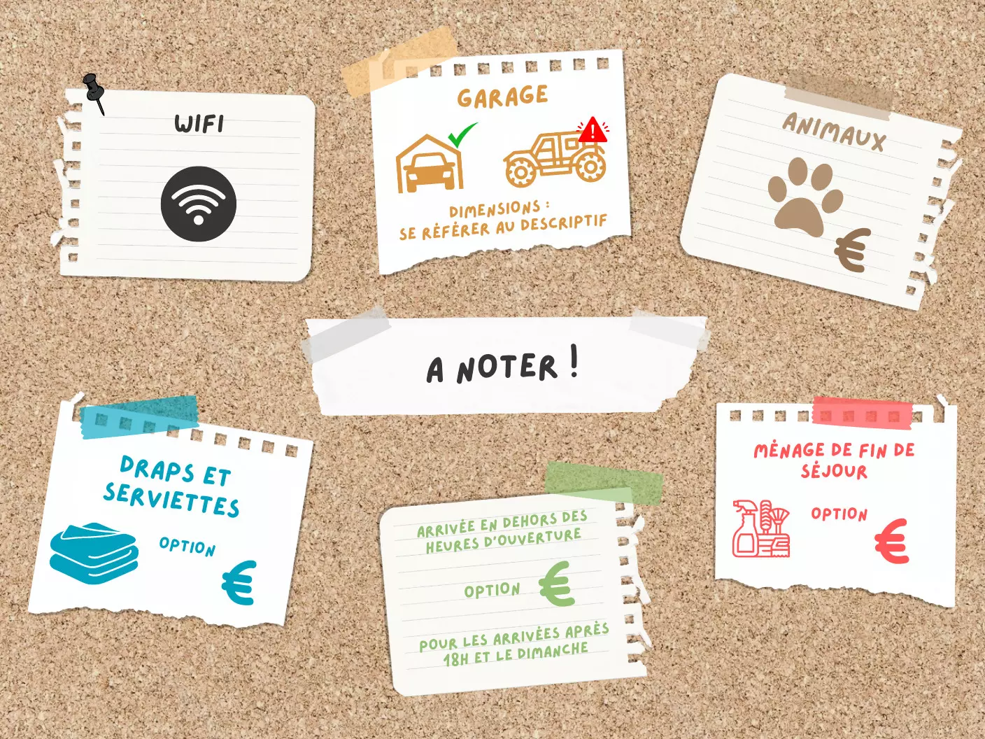 - Rental of sheets, pillowcases, towels, bath mats, tea towels: email sent 20 days before arrival to order linen (order to be placed at the latest 10 days before arrival).