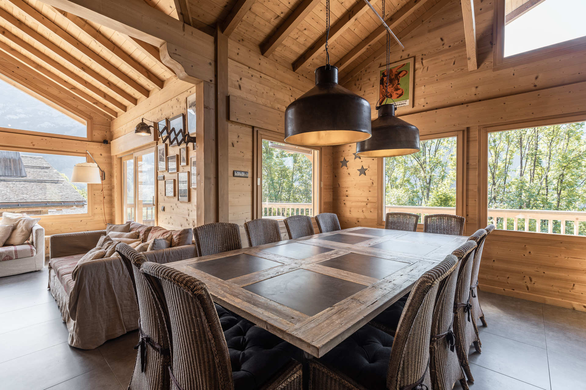 - LIVING CUM DINING ROOM (45.32 m²): FIREPLACE, east facing window + bay window, next door chalet view, south facing sliding bay window, south-east facing terrace, mountain view