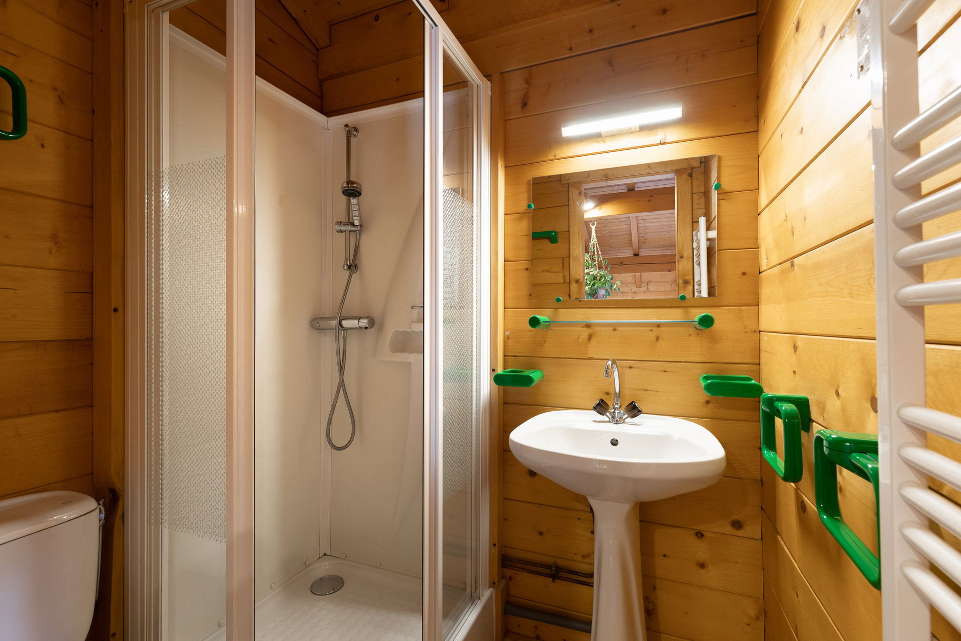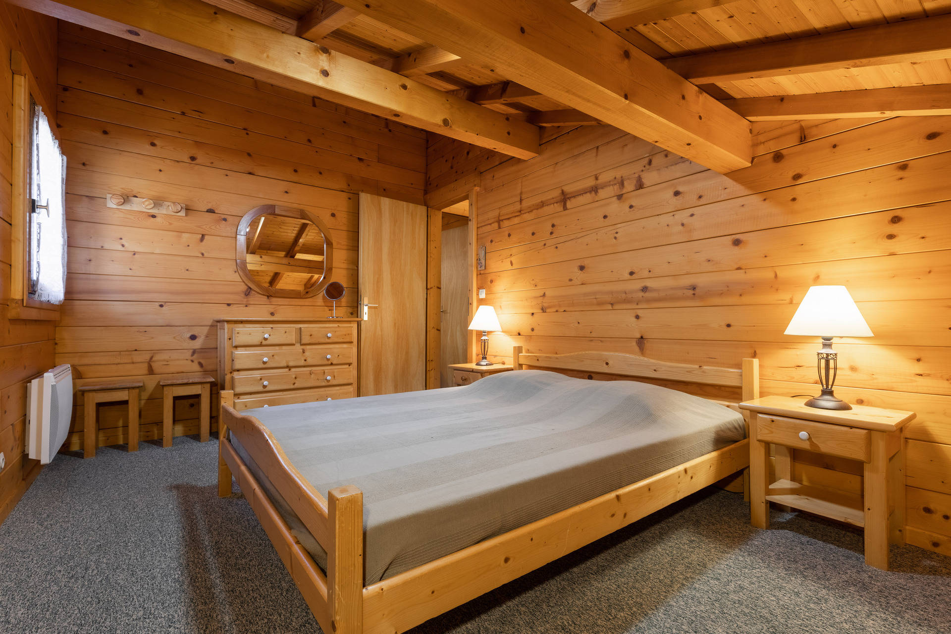 - BEDROOM (14.74 m² including 6.12m² mansard roofed): 1 DOUBLE BED (2 mattresses of 80), small east facing window, next door chalets / vegetation view