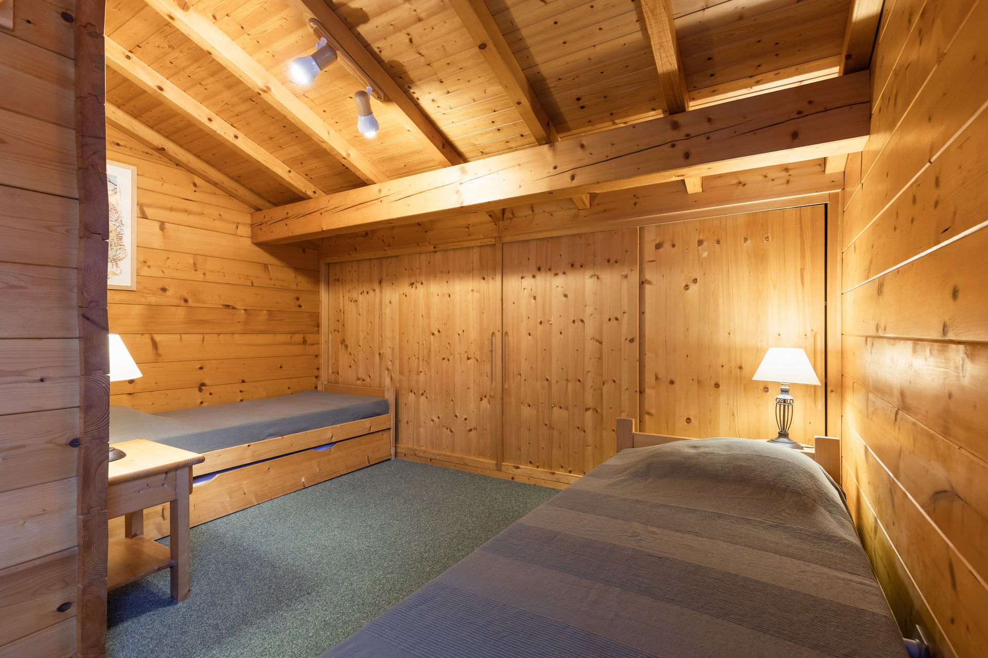 - BEDROOM (12.05 m² including 2.15m² mansard roofed) : 2 SINGLE BEDS (80) + 1 SINGLE PULL-OUT BED (80), west facing French window + balcony, next door chalets / mountain view