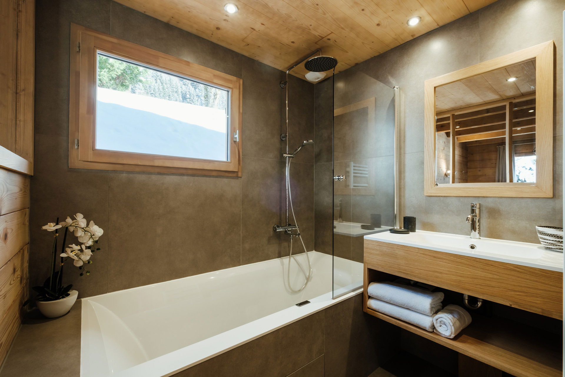 - BEDROOM (9.43 m²) : DOUBLE BED (160), north facing window, next door chalets / vegetation view, ensuite shower room (3.75 m²) : bathtub, washbasin, TOWELDRYER radiator, west high window.