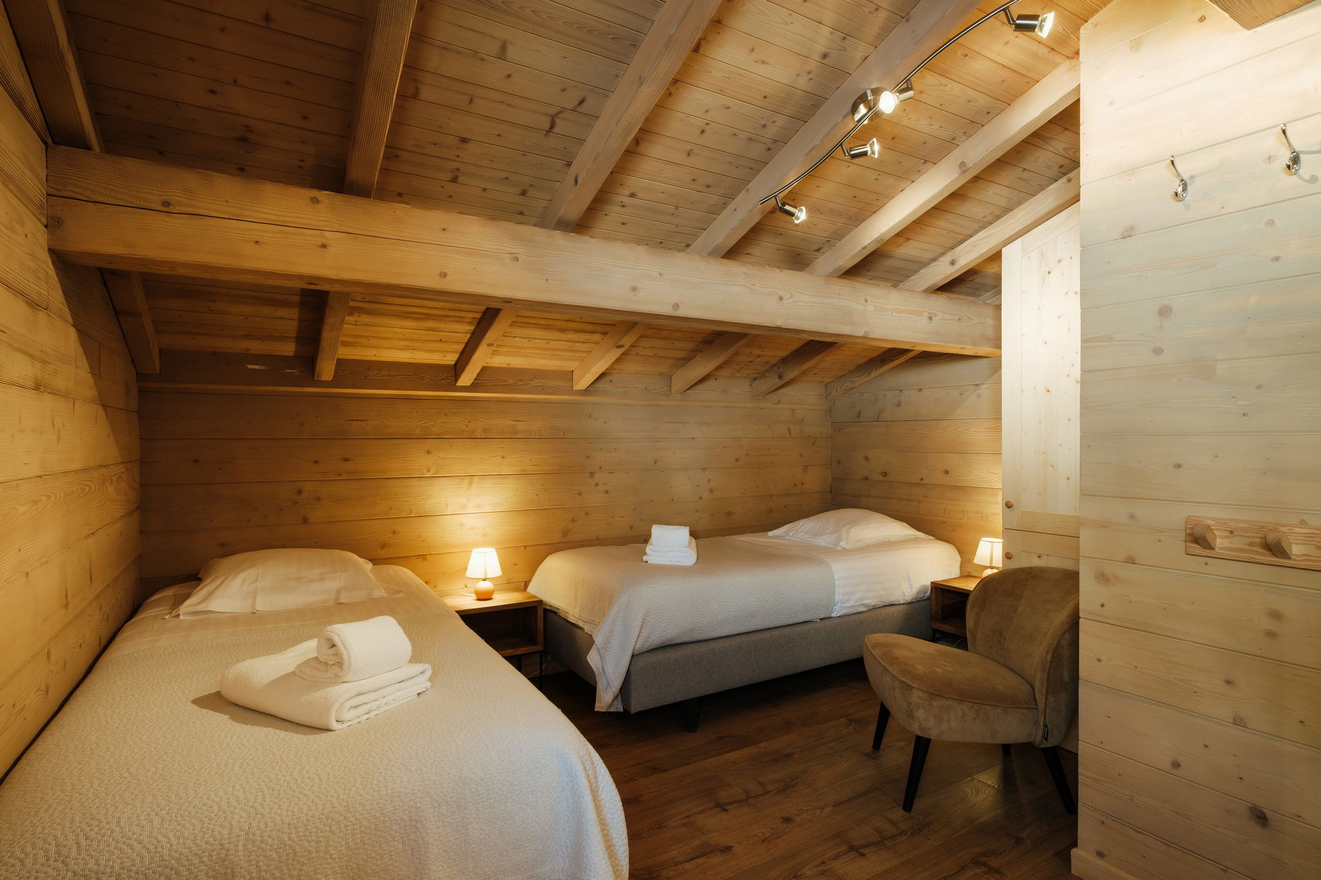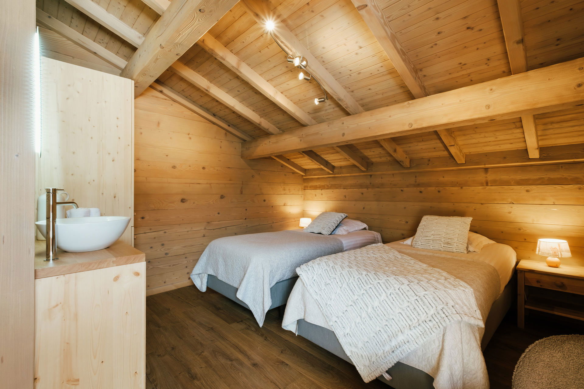 - BEDROOM (12.45 m² including 2.62m² mansard roofed) : 2 SINGLE BEDS (90), washbasin, west French window + terrace access, next door chalets / mountain view