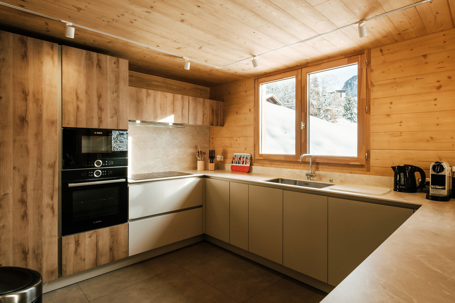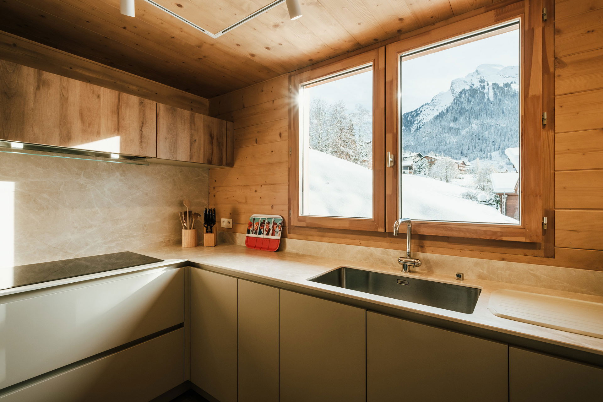 - KITCHEN (13.74 m²) : fridge + freezer (286 L), INDUCTION STOVE, oven, MICROWAVES, DISHWASHER, NESPRESSO coffee machine, South facing window, next door chalets / vegetation view.