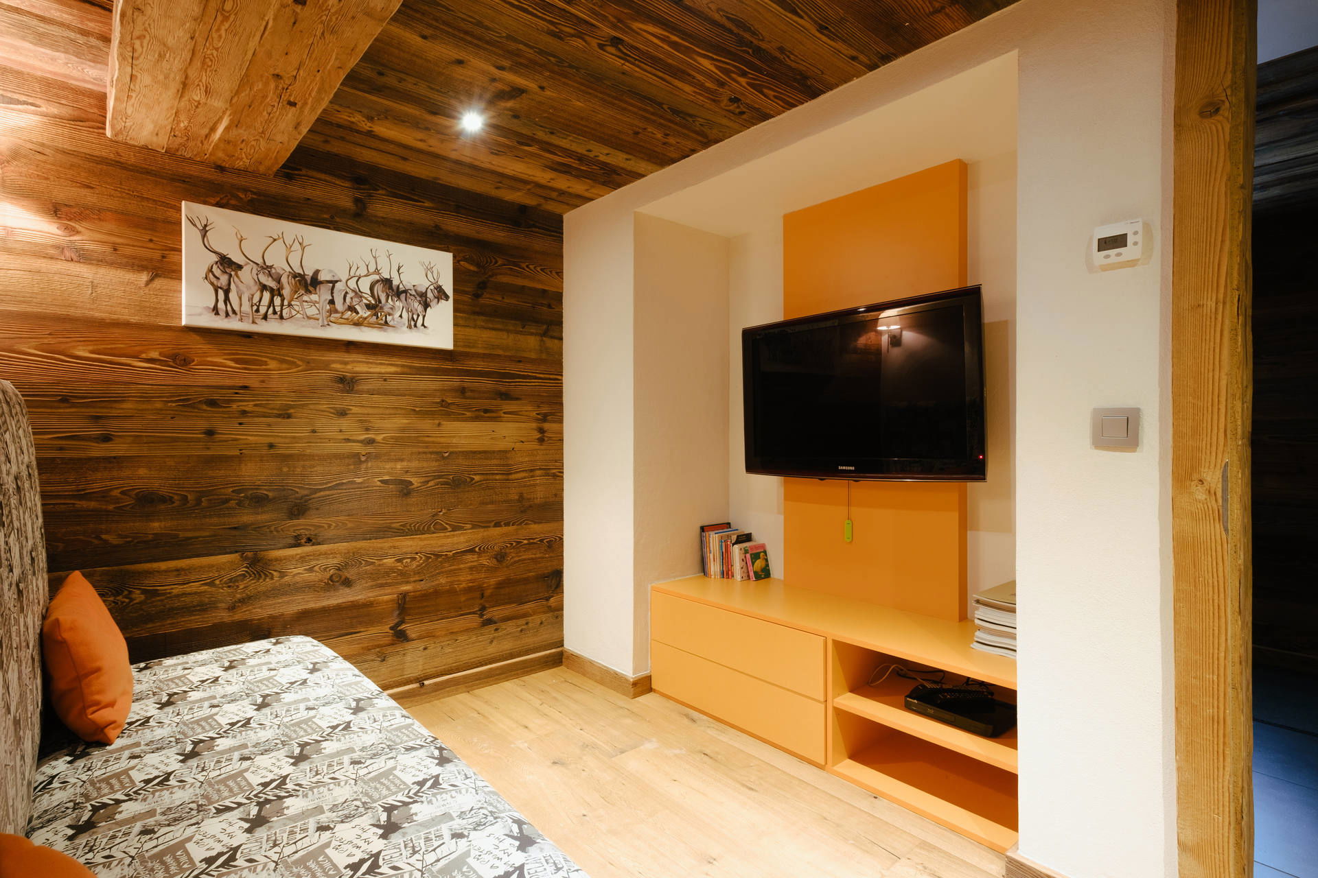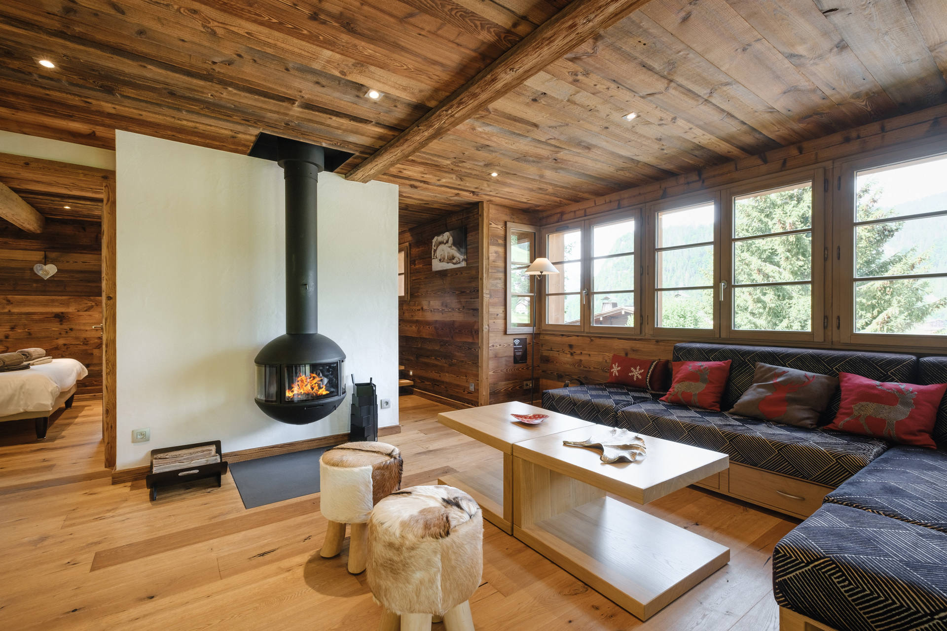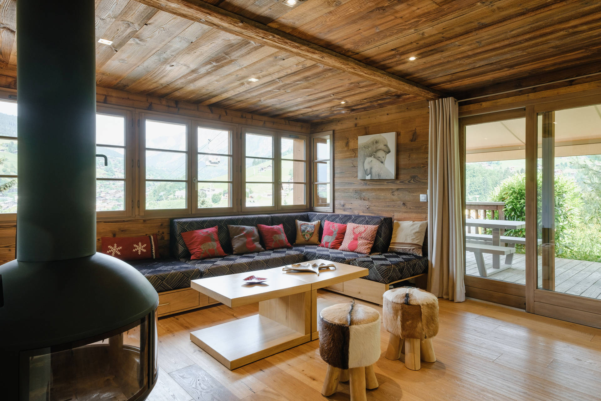- LIVING ROOM (34.81m²): flat screen TV + DVD player, suspended FIREPLACE + eating place, north facing window, east facing windows, village / mountain view, south facing sliding bay window + terrace, mountain / next door chalet view
