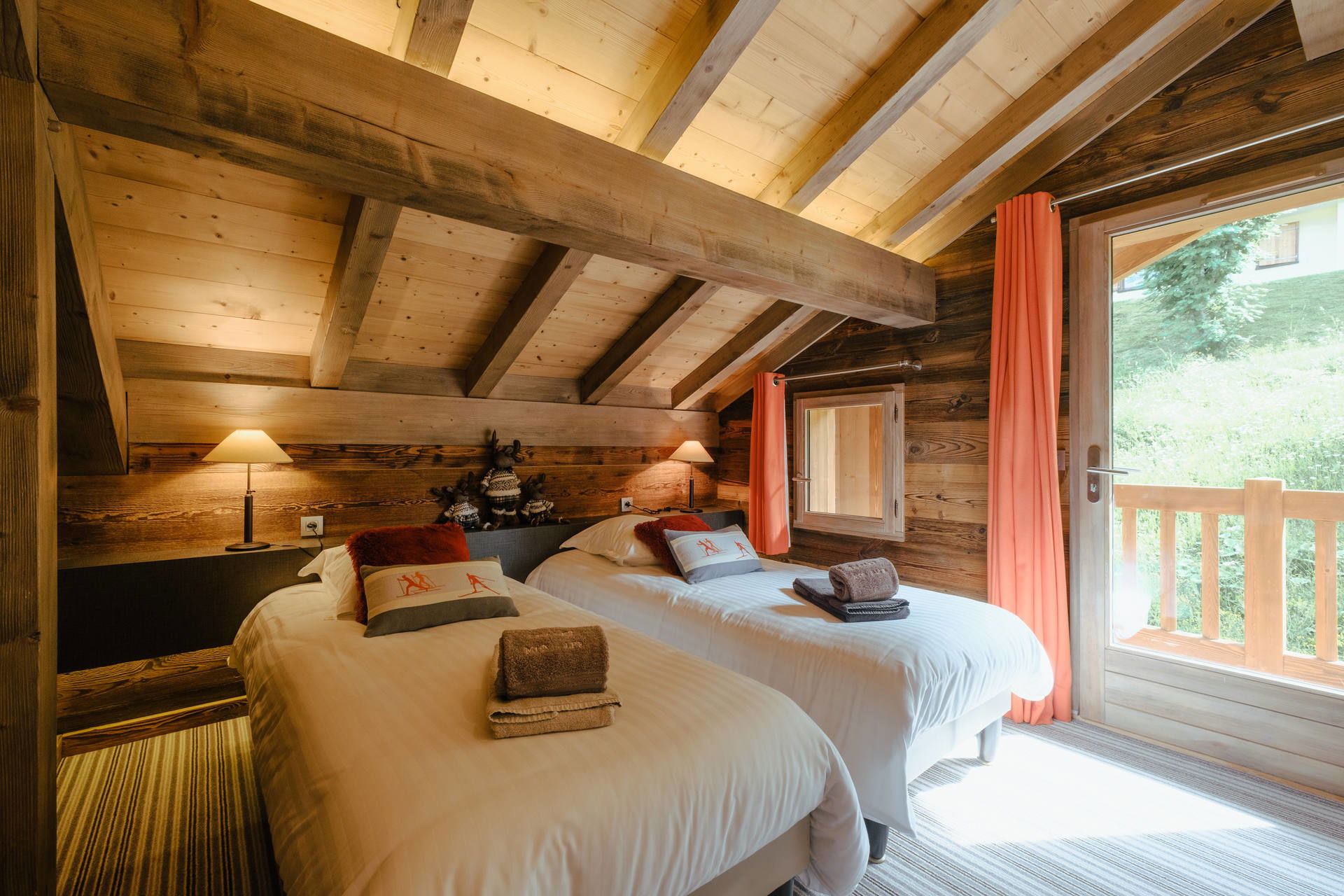 - BEDROOM (13.46m² including 1.66m² mansard roofed): 2 SINGLE BEDS (90x200), west facing window + French window + balcony, vegetation / next door chalet view