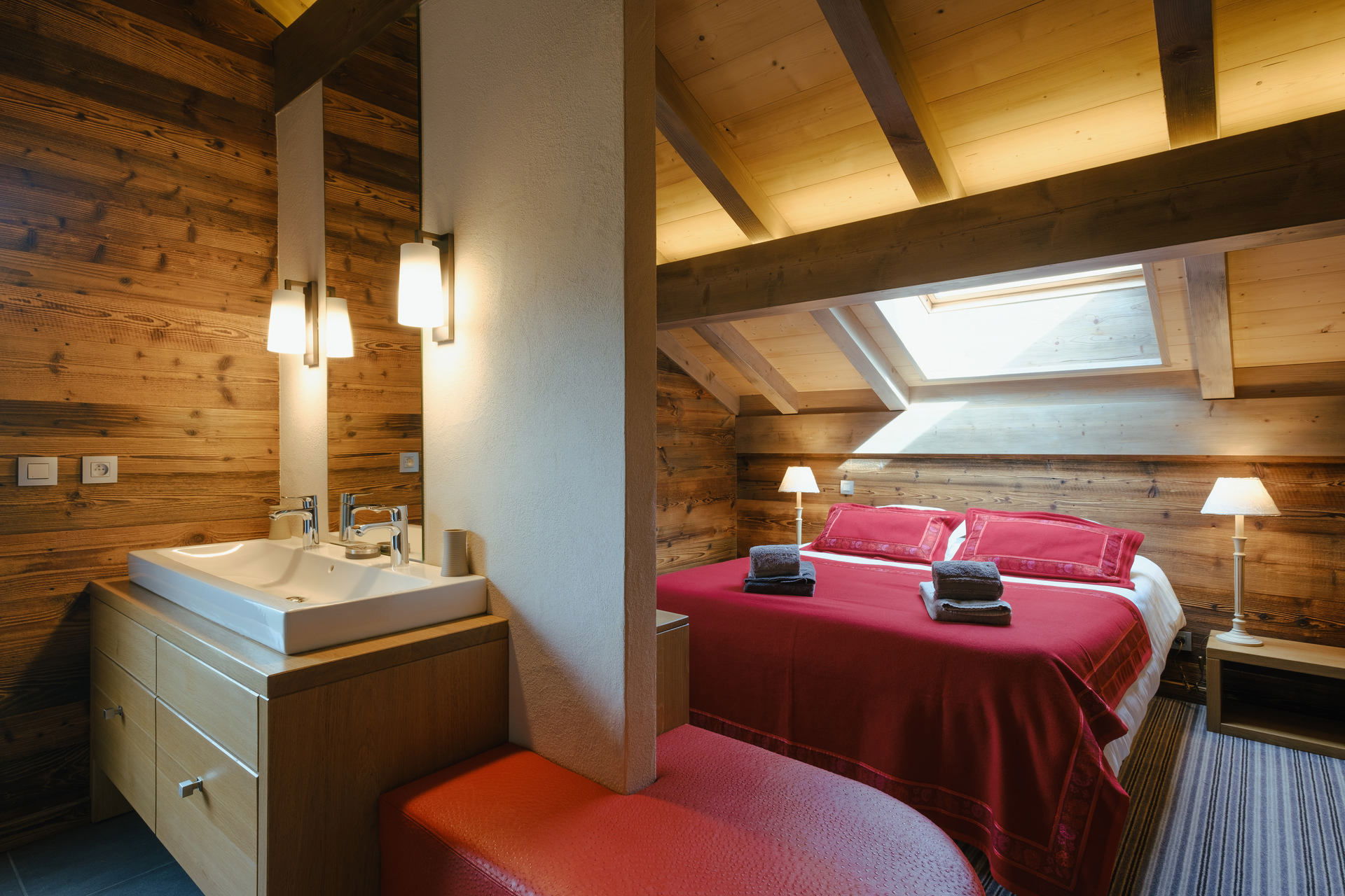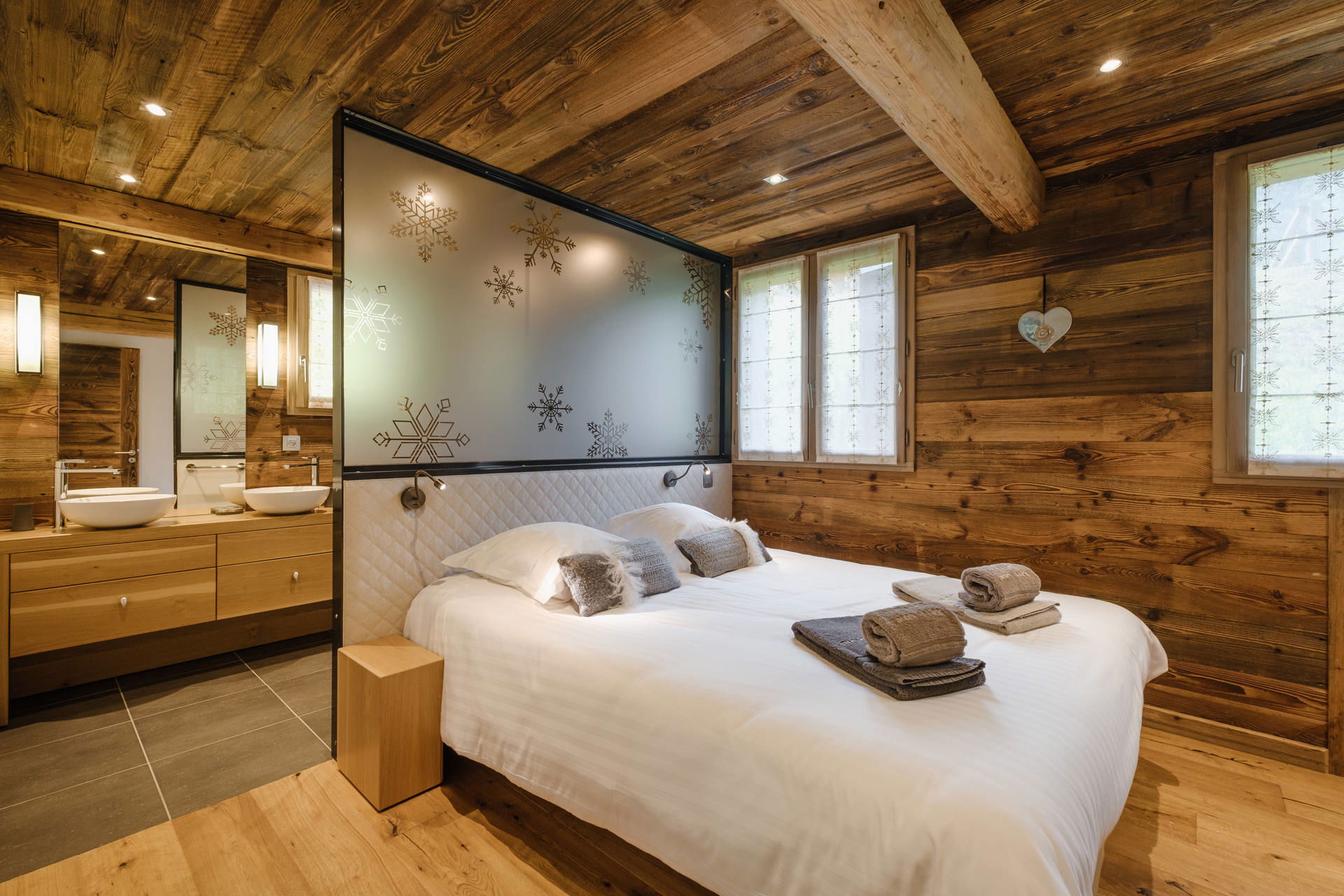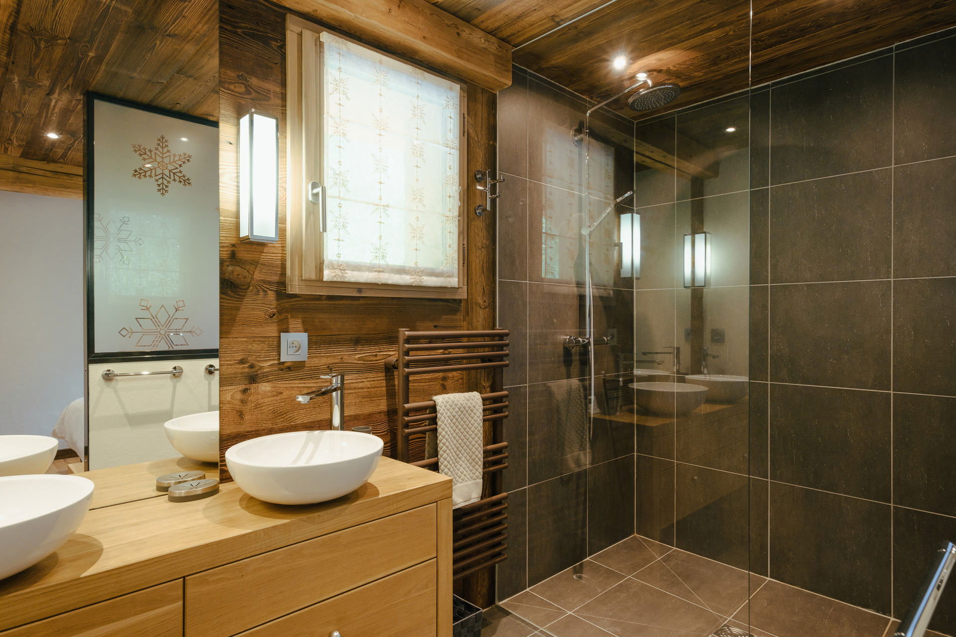 - En-suite SHOWER ROOM (4.23m²) communicating with both bedrooms: twin vanity sinks, bathtub, TOWEL DRYER radiator, small west facing window, vegetation / next door chalet view