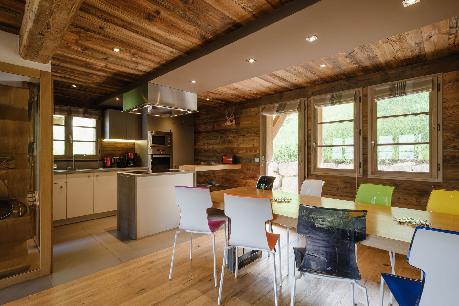 - Open KITCHEN (3.35m²): FRIDGE + FREEZER (285 L), OVEN, MICROWAVE, INDUCTION STOVE, DISHWASHER, NESPRESSO coffee machine, east + south facing windows, mountain / next door chalet view, west facing windows + French window, next door chalet view
