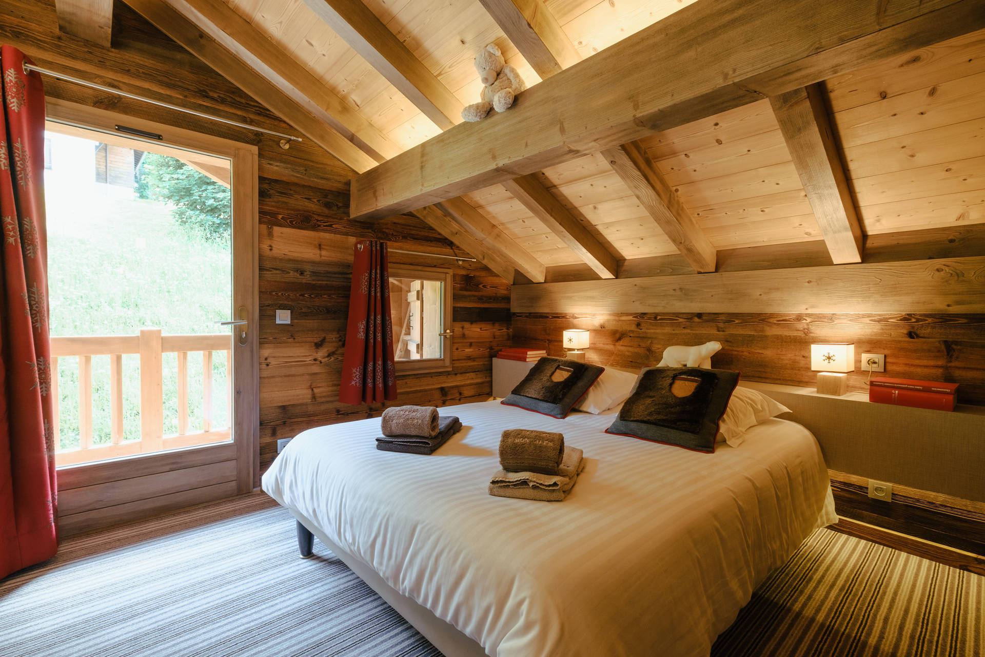 - BEDROOM (14.46m² including 1.66m² mansard roofed): 1 DOUBLE BED (160), west facing window + French window + balcony, vegetation / next door chalet view