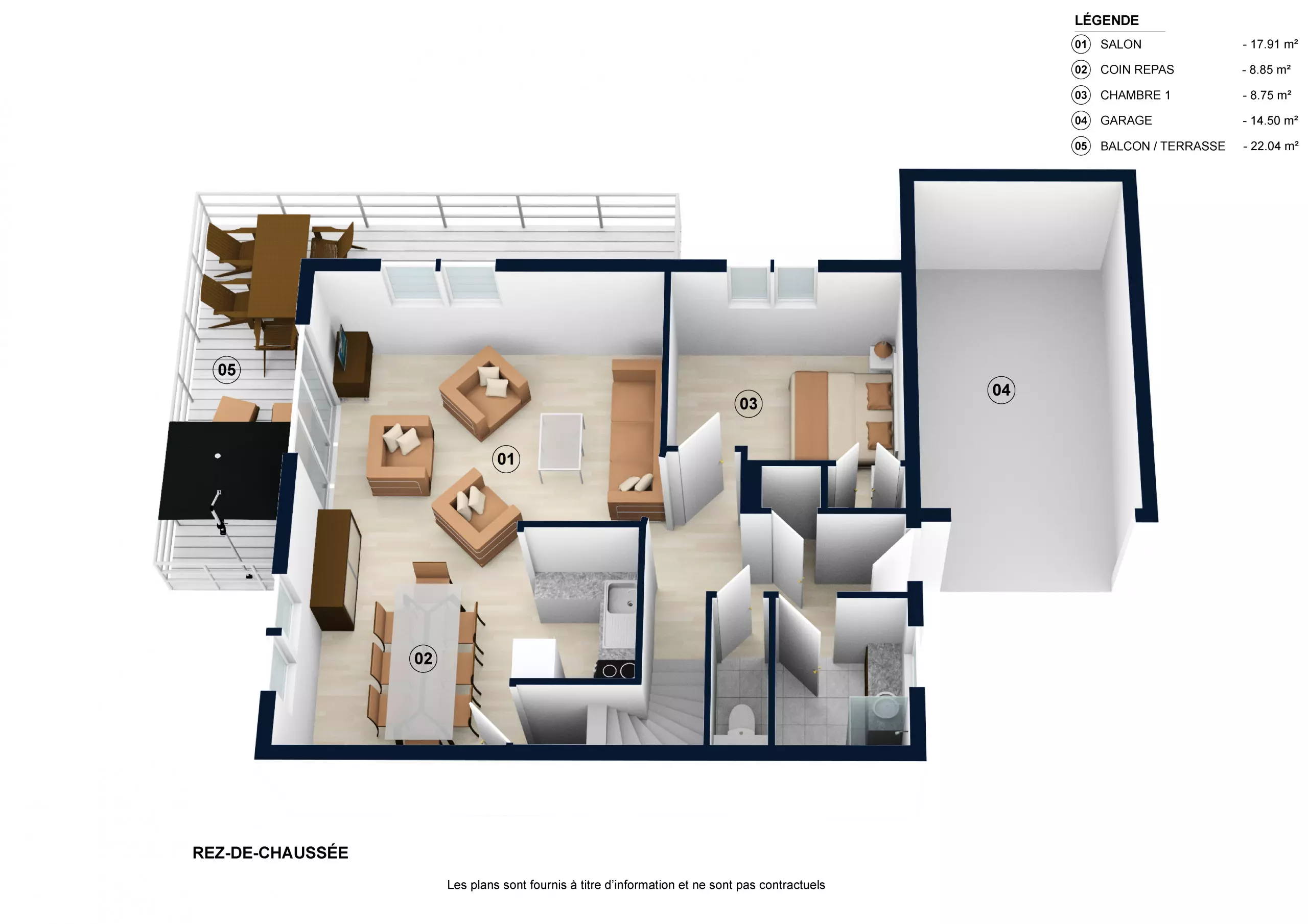 LIVING ROOM: (tiled floor) 27 m2, a comfortable sofa with armchairs, television, windows and bay windows opening onto a balcony/terrace of 18 m2 facing southwest. Garden furniture.