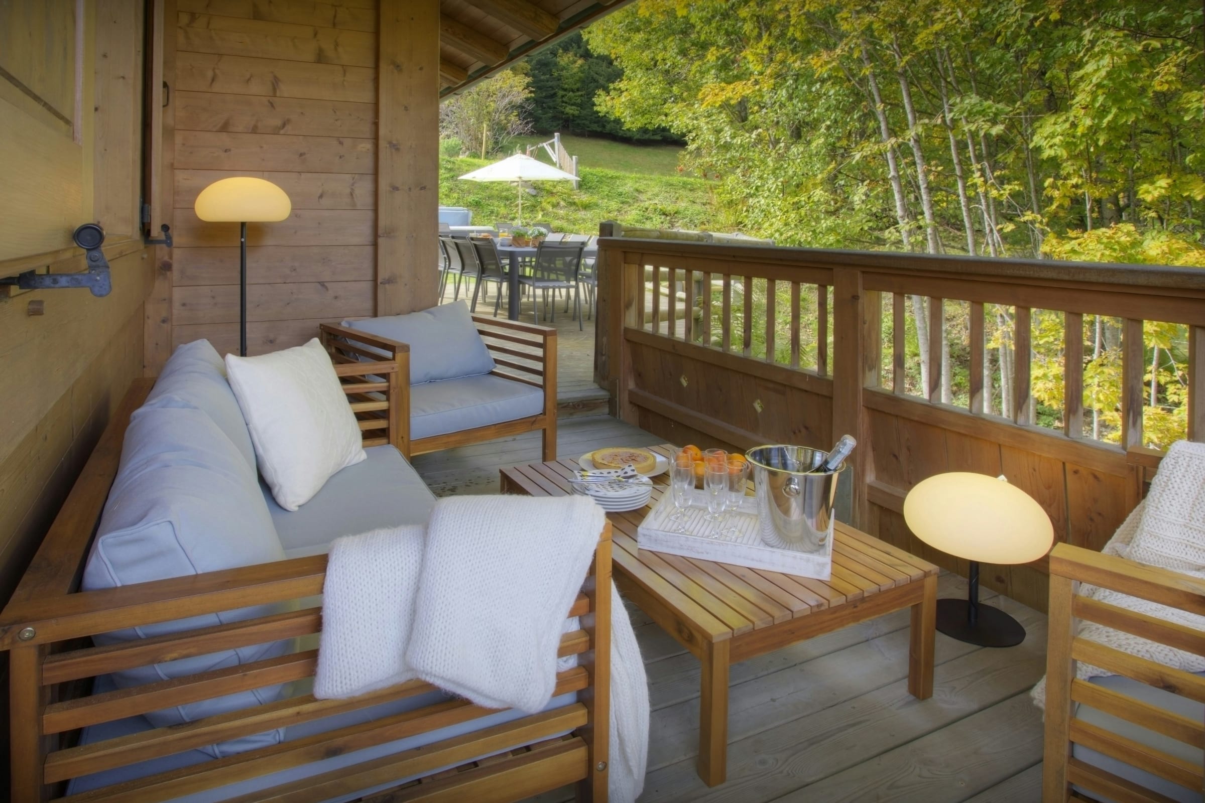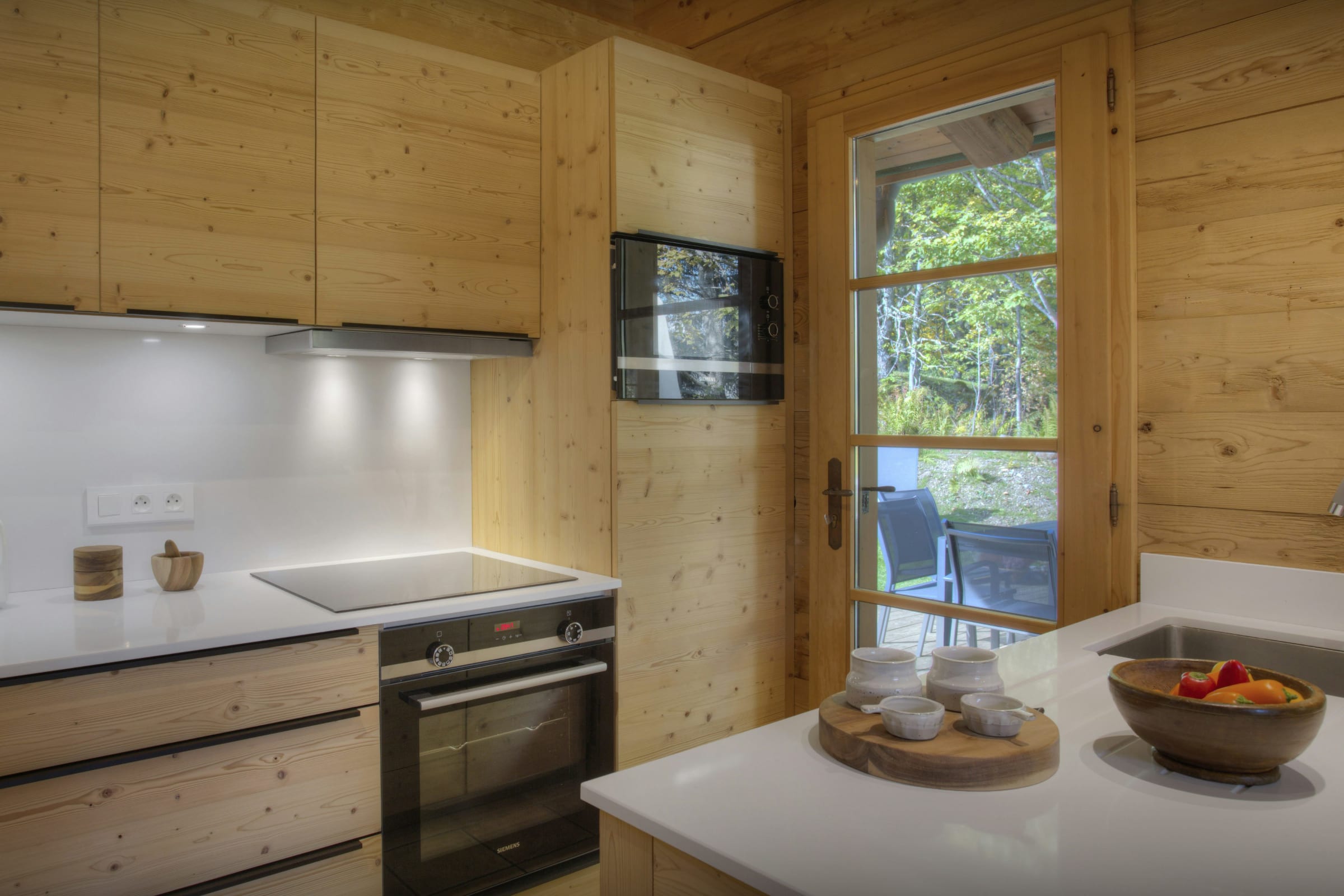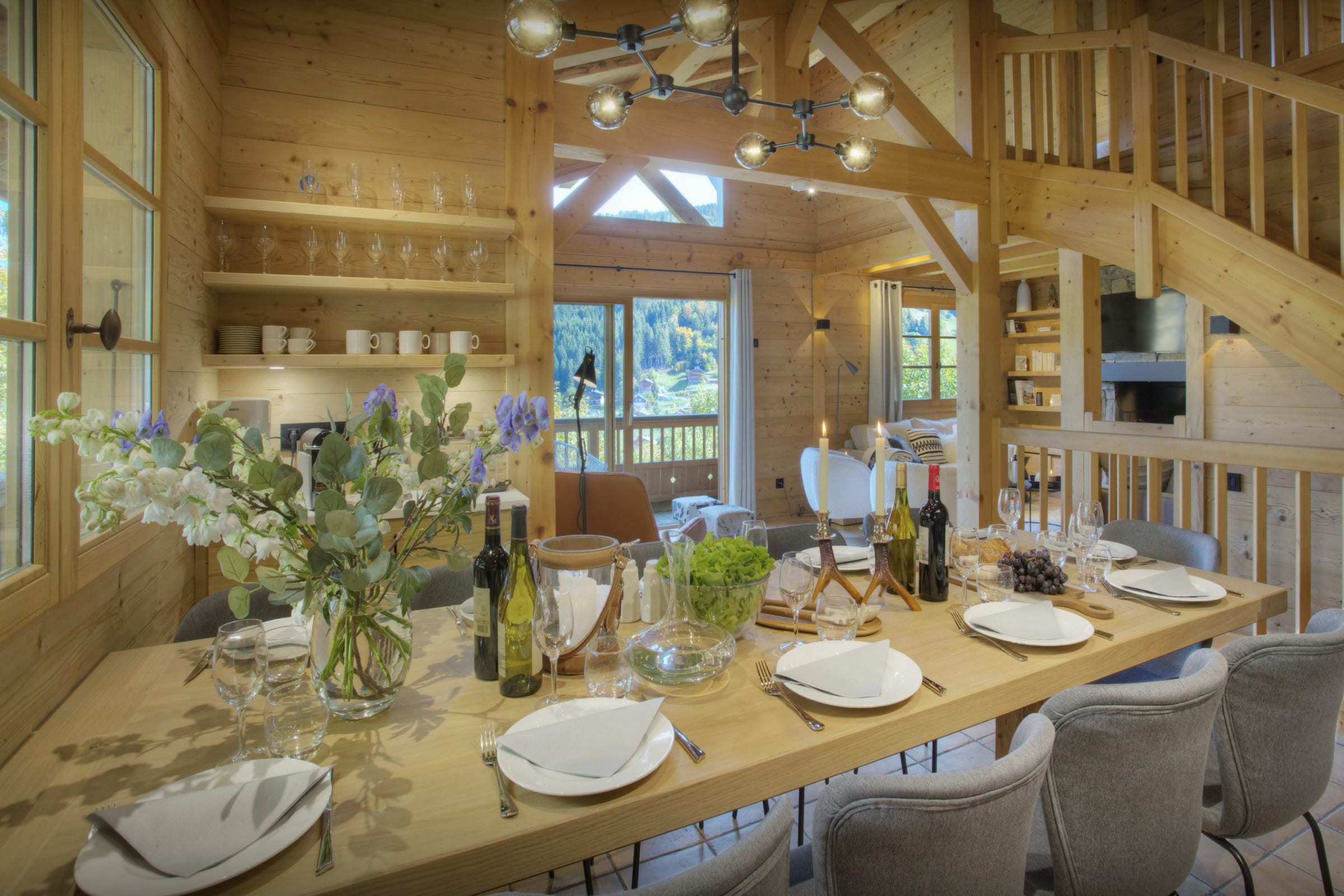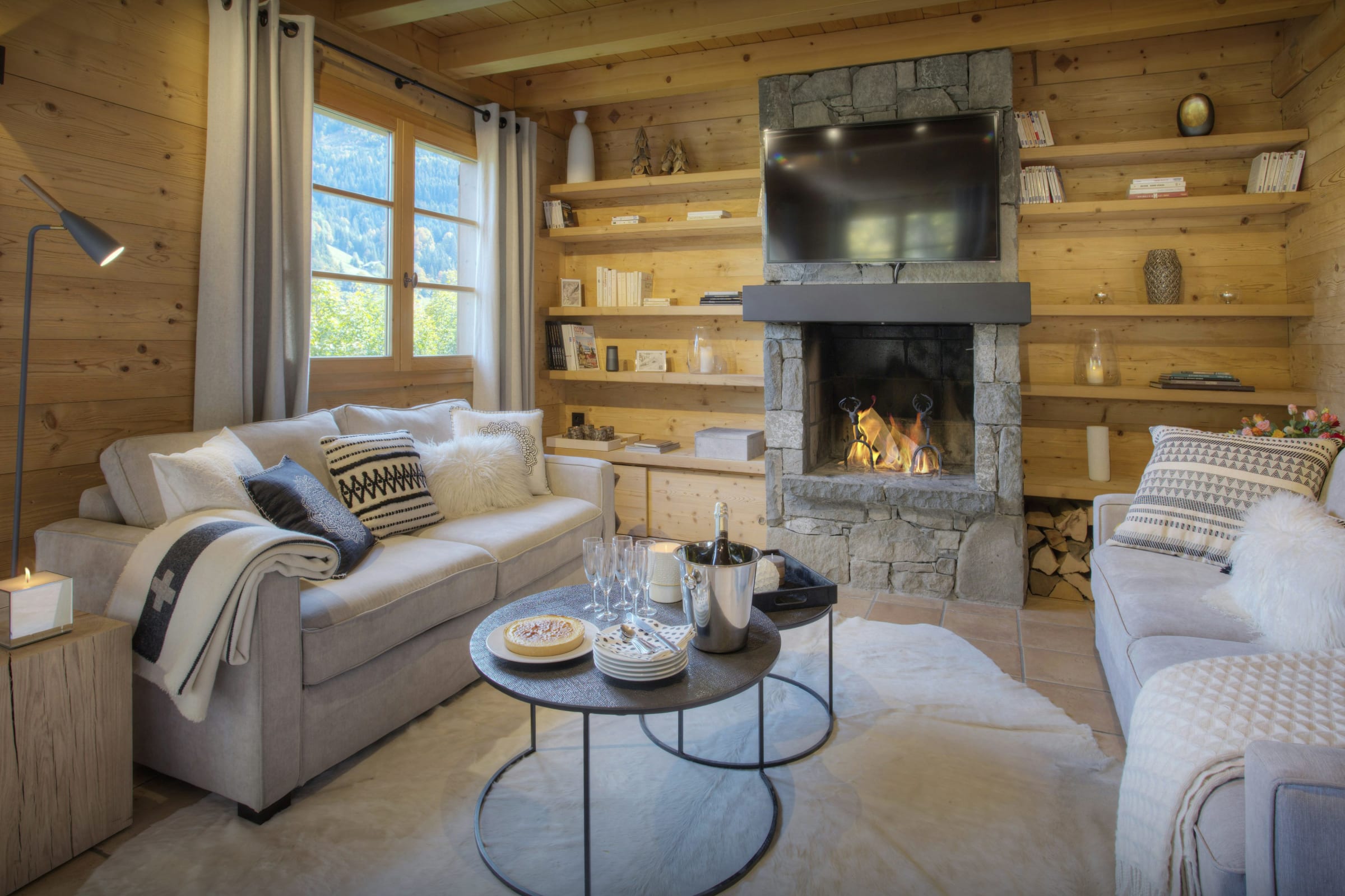 The main living area has two separate seating areas - cosy sofas sound the fire and a separate area next to the doors opening on to the terrace where you can relax with a book and make the most of the wonderful light. The decor is neutral but warm and the room layout makes the most of the chalet's exposed wooden framework.