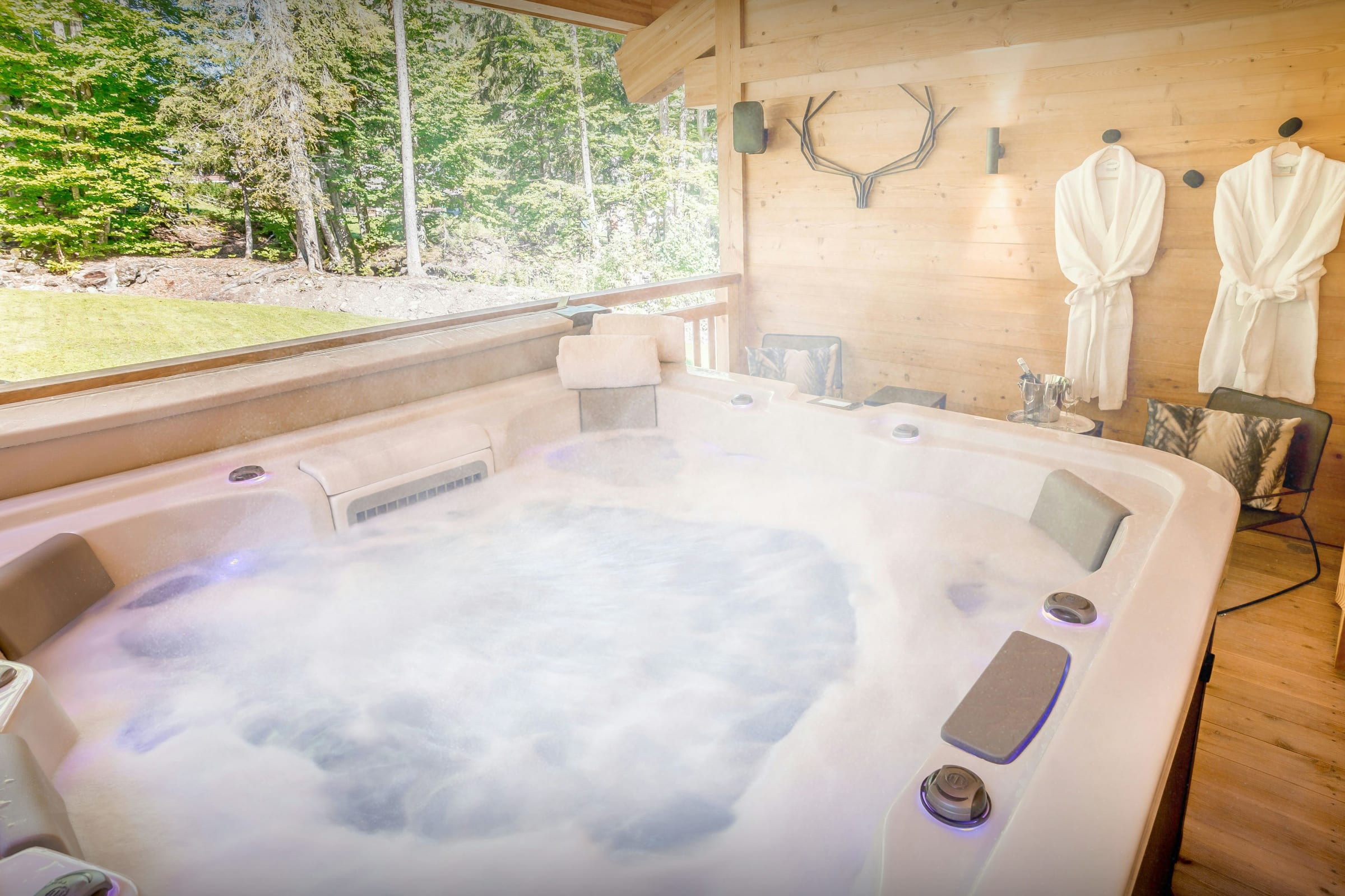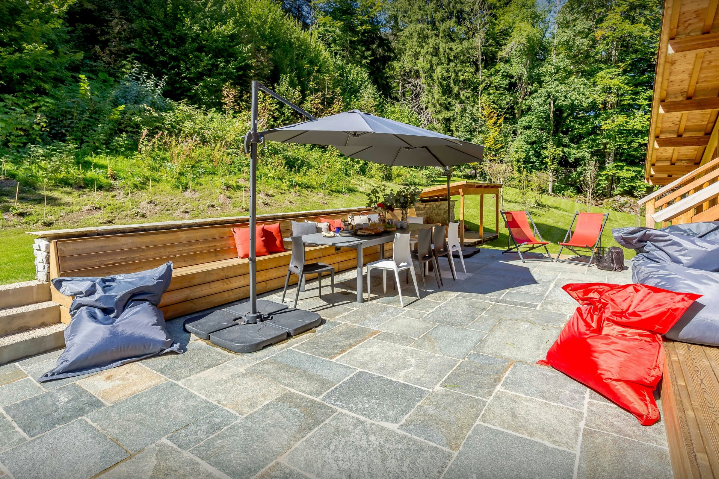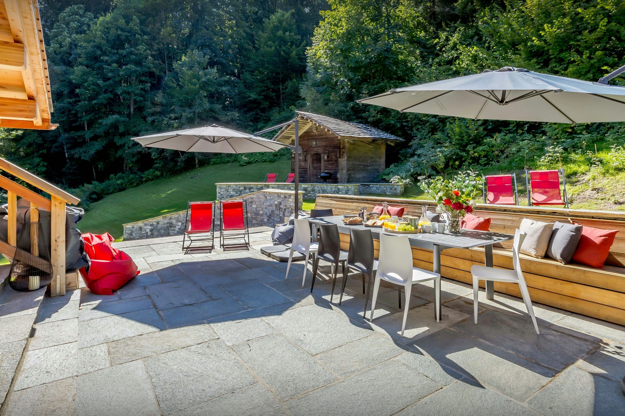 After a day in the mountains, it's great to return to the chalet and relax in the sauna and hot tub before enjoying a pre-dinner apero on the terrace, underneath the stars. The only intrusion you may have is from the telecabine passing overhead during the day, the owners have landscaped the garden to ensure privacy as much as possible, and the hot tub is on a sheltered terrace on the opposite side of the chalet.