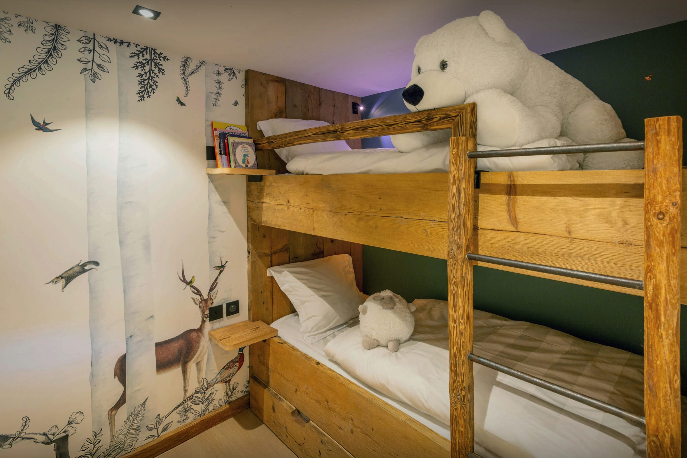 The final bedroom is the family suite – a double room and a connected bunk room, sleeping a total of four. This suite also has an en-suite bathroom and a separate WC.