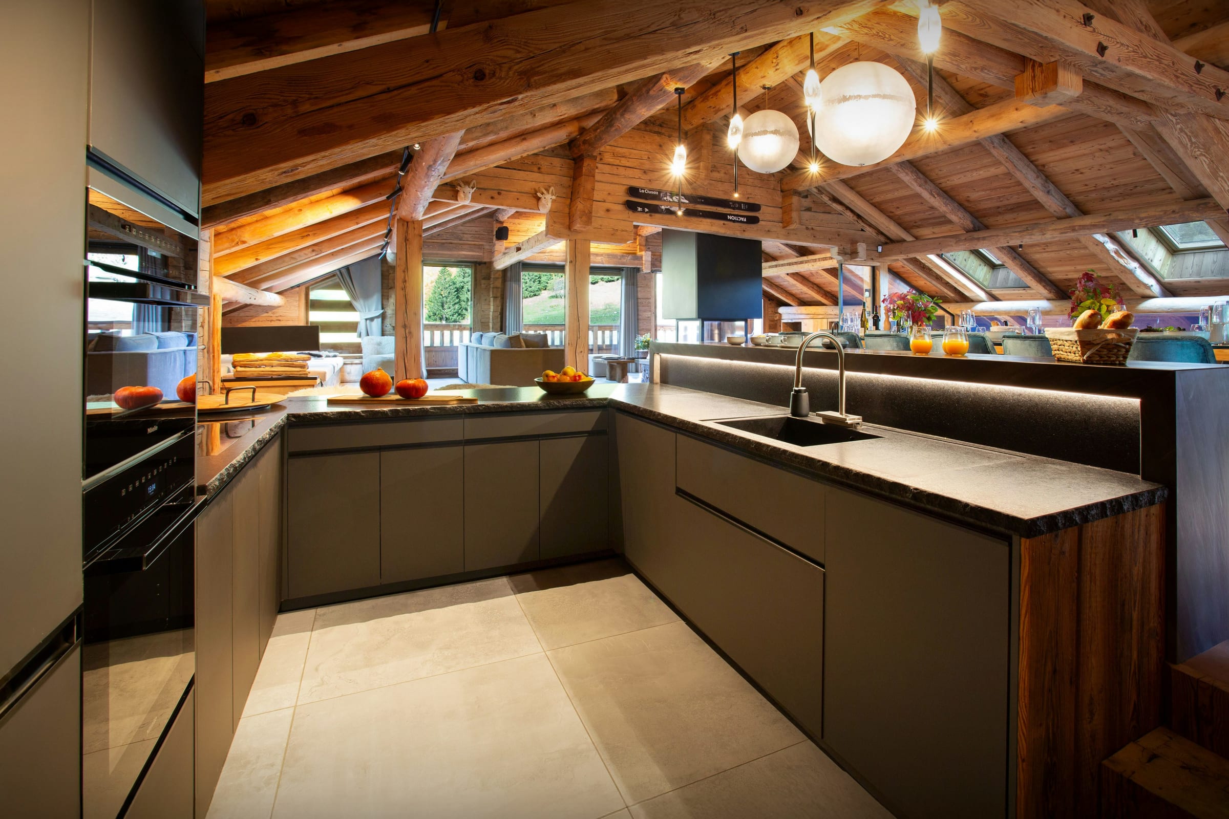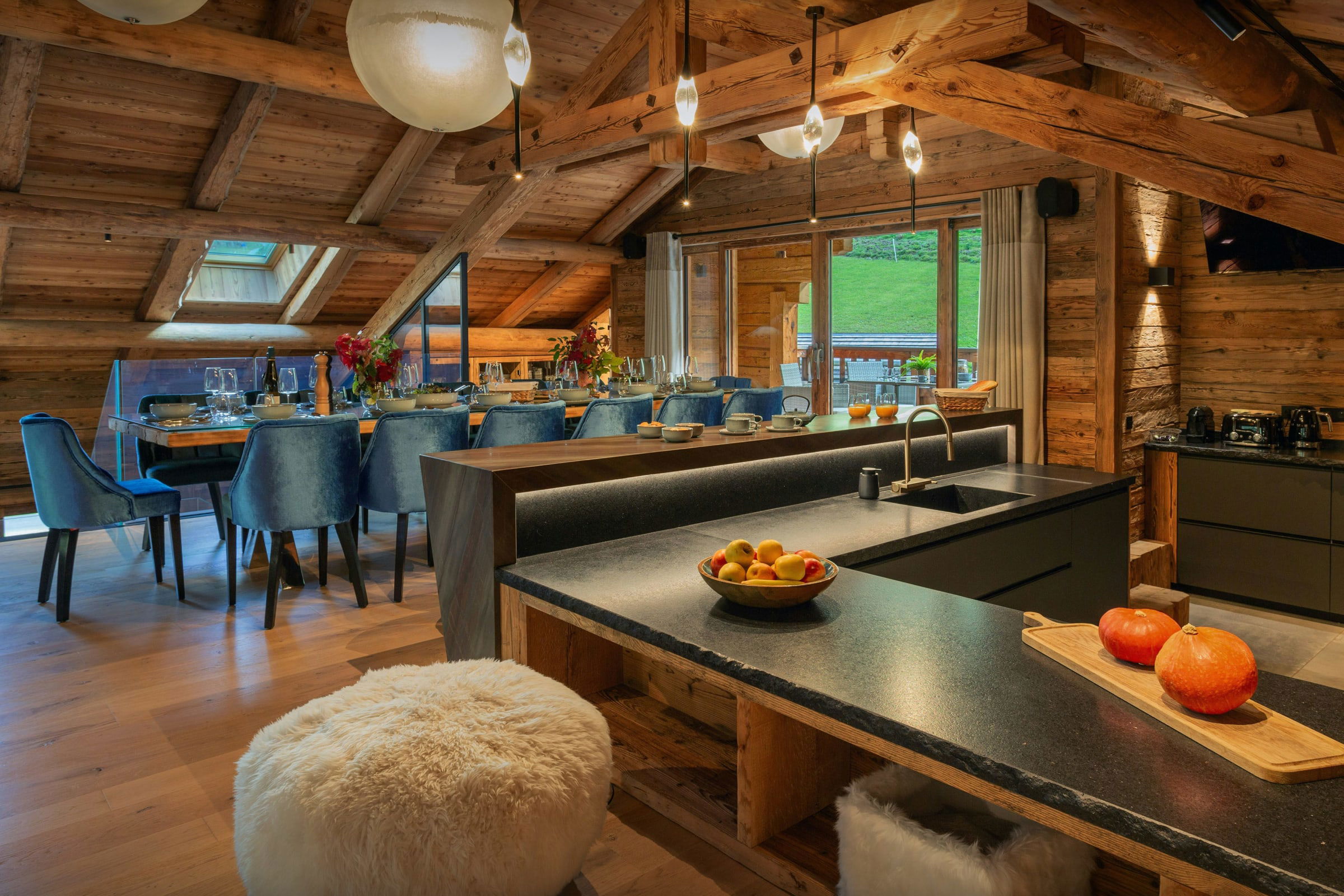 Designed to make the most of the incredible views, the spacious living area takes up the whole of the top floor, with two heated balconies. Inside, a central fireplace separates the cosy seating area from the large dining table, and the fully-equipped kitchen has top-of-the-range appliances, including a huge American-style fridge freezer. There's a breakfast bar as well as a bar area – mix up your cocktails and head out onto the balcony to enjoy them!