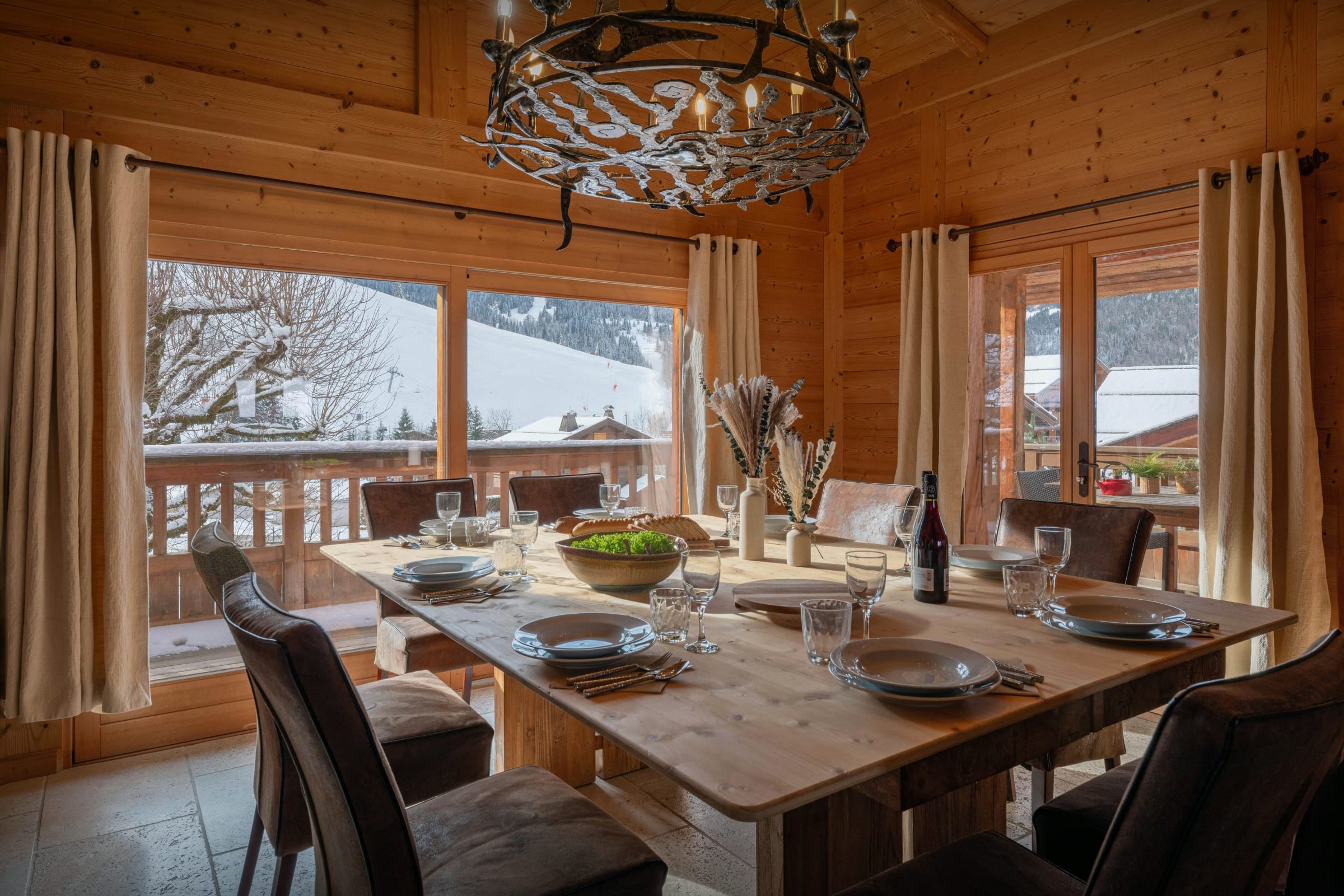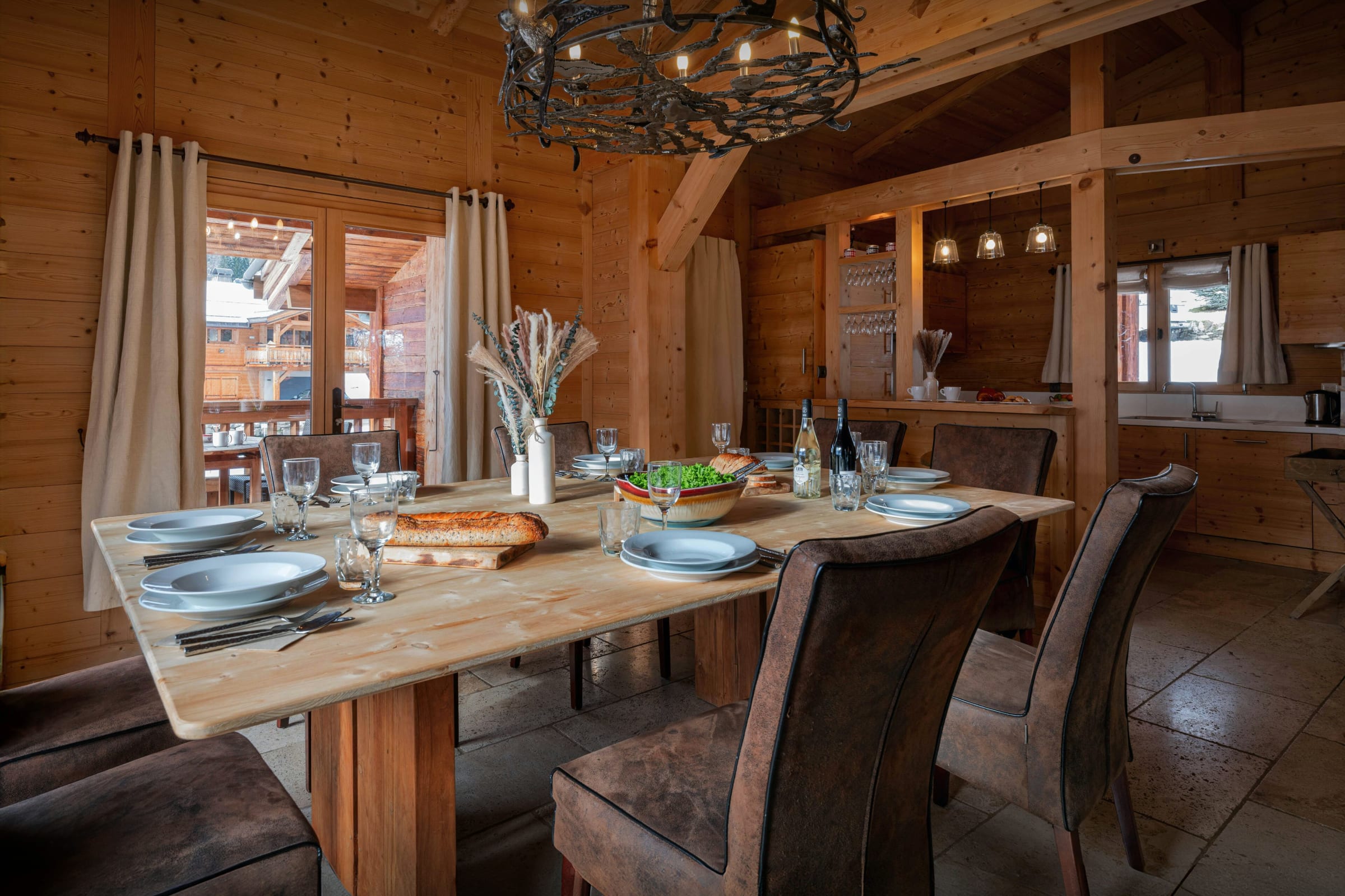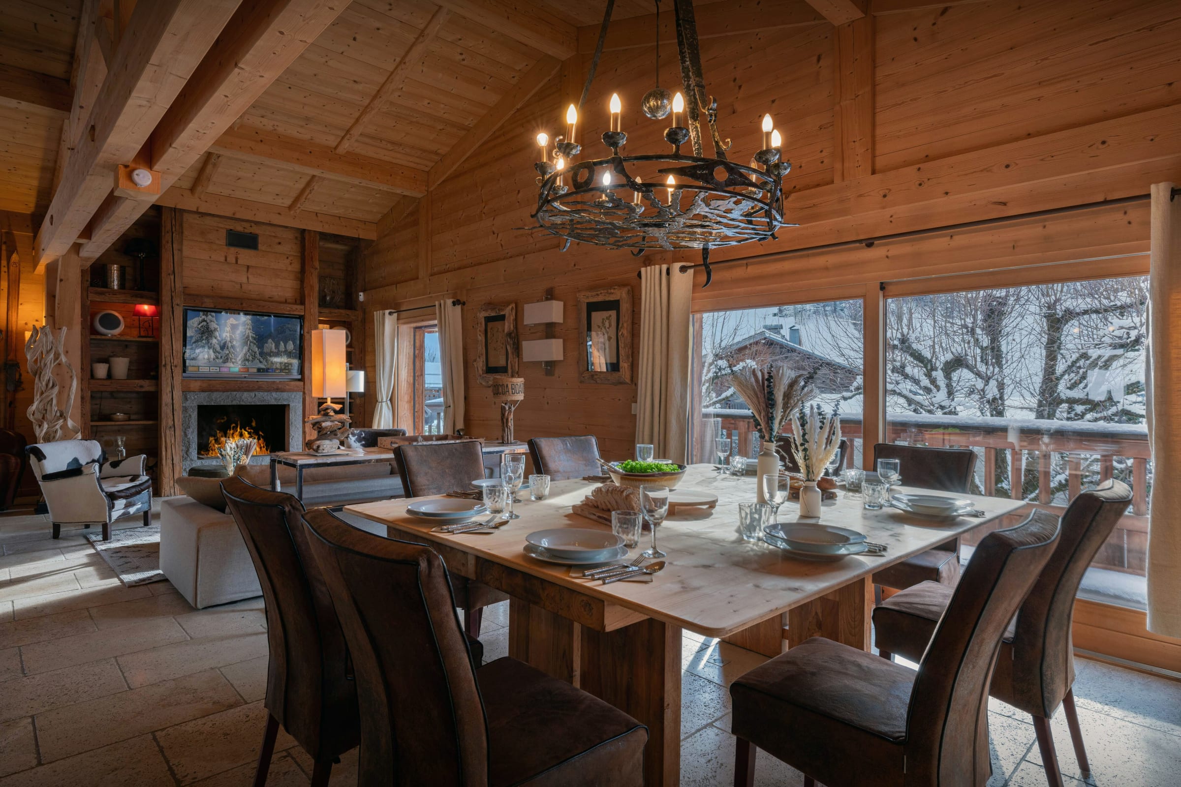 The open-plan kitchen has everything you need to cook tasty meals, which you can enjoy at the dining table. On sunny days, head out to the south-facing terrace, where a second table lets you enjoy al fresco meals overlooking the garden and the peaks of the Aravis mountains.