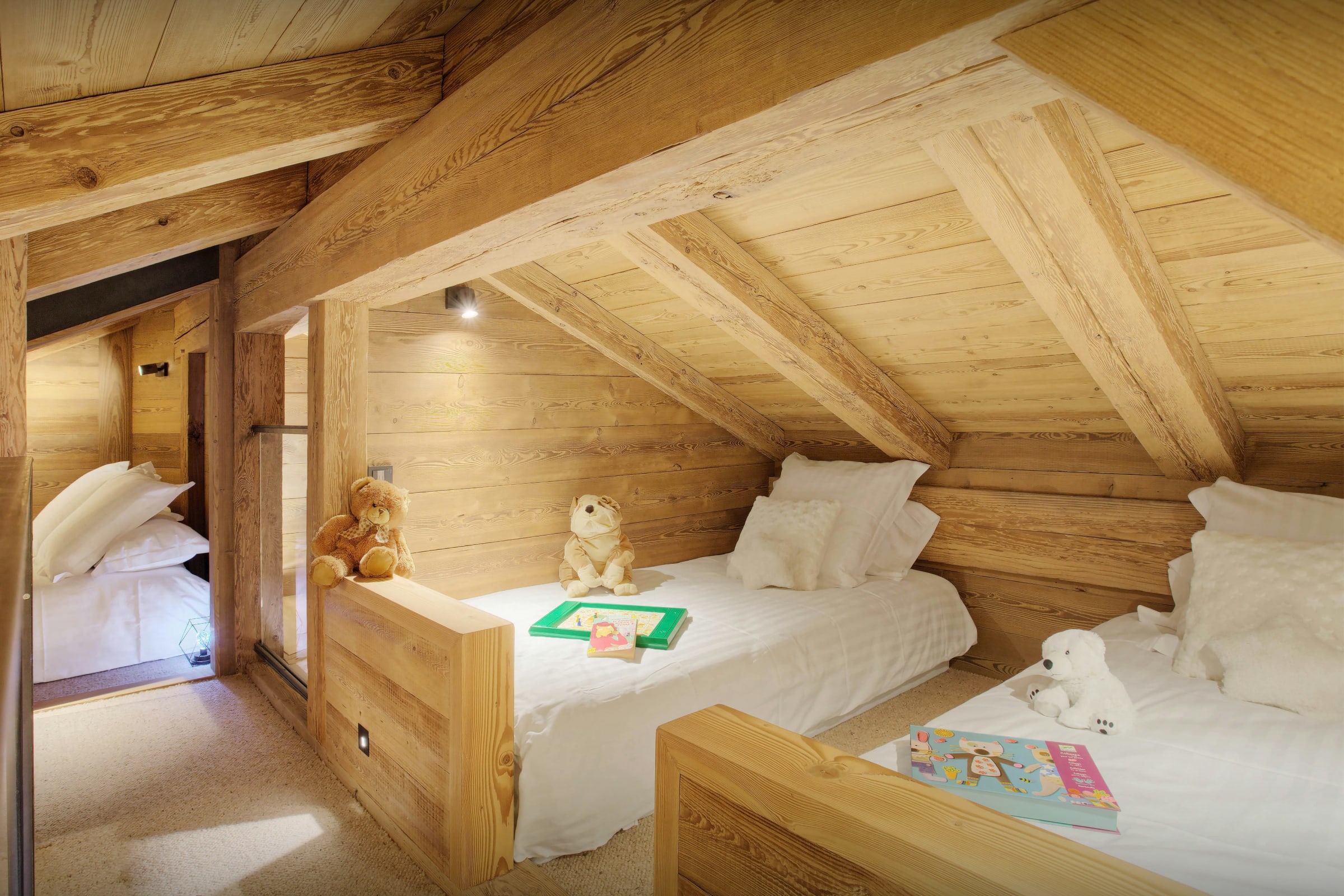On the lower floor, there is a garage for two cars. The ski room at the entrance is well designed, with plenty of storage space. Upstairs, the floor is entirely dedicated to relaxation: home cinema; gym; sauna; shower; and a jacuzzi on the terrace.