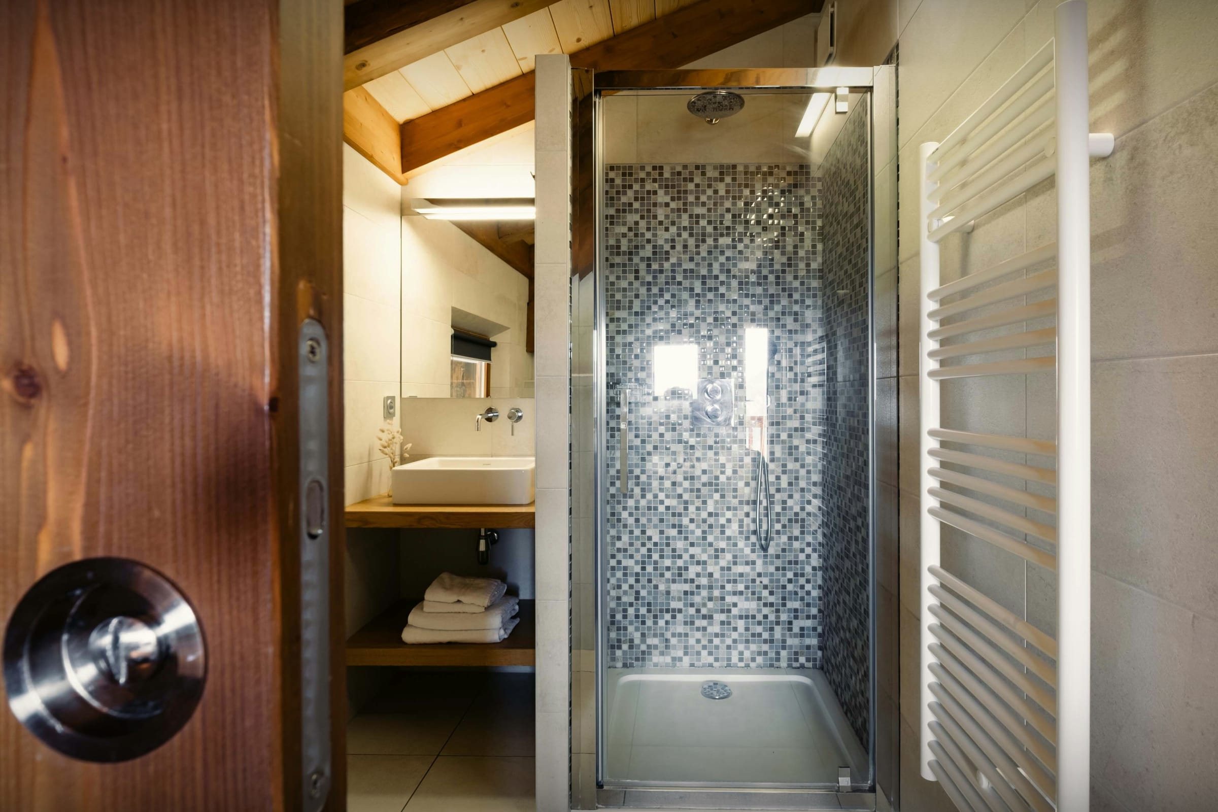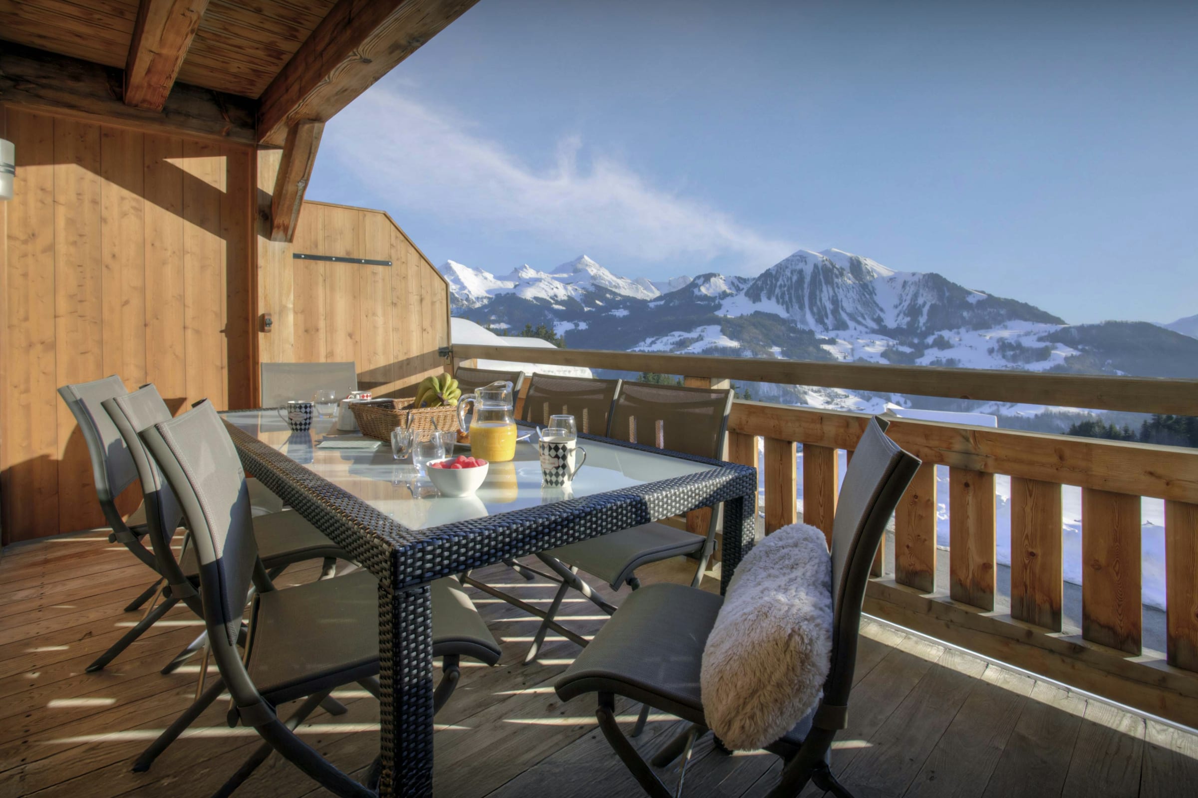 Le Peille has south facing balconies and a dining terrace to the west of the chalet from which to catch the sunset every night. There are only shower rooms in Le Peille. If you don't want to share a garage, or parking spaces this is not the property for you. The hammam is accessed via the garage, bath robes are provided.